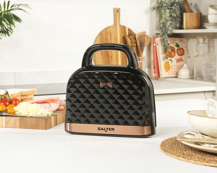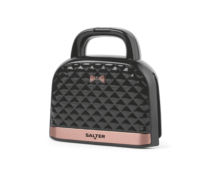 Make chic cooking simple with this superb Handbag Style Sandwich Toaster from Salter. Complete with diamond embossed housing and rose gold accents, this compact appliance pre-heats in three minutes, with temperatures reaching up to 200°C. Suitable for smaller loaves, the non-stick interiors allow for easy cleaning, and the 21.5 x 12.5 cm plates allow you to cook two of your favourite toasted sandwiches at once. Unique in design, this appliance also includes a carry handle – combining food and fashion for everyday use.