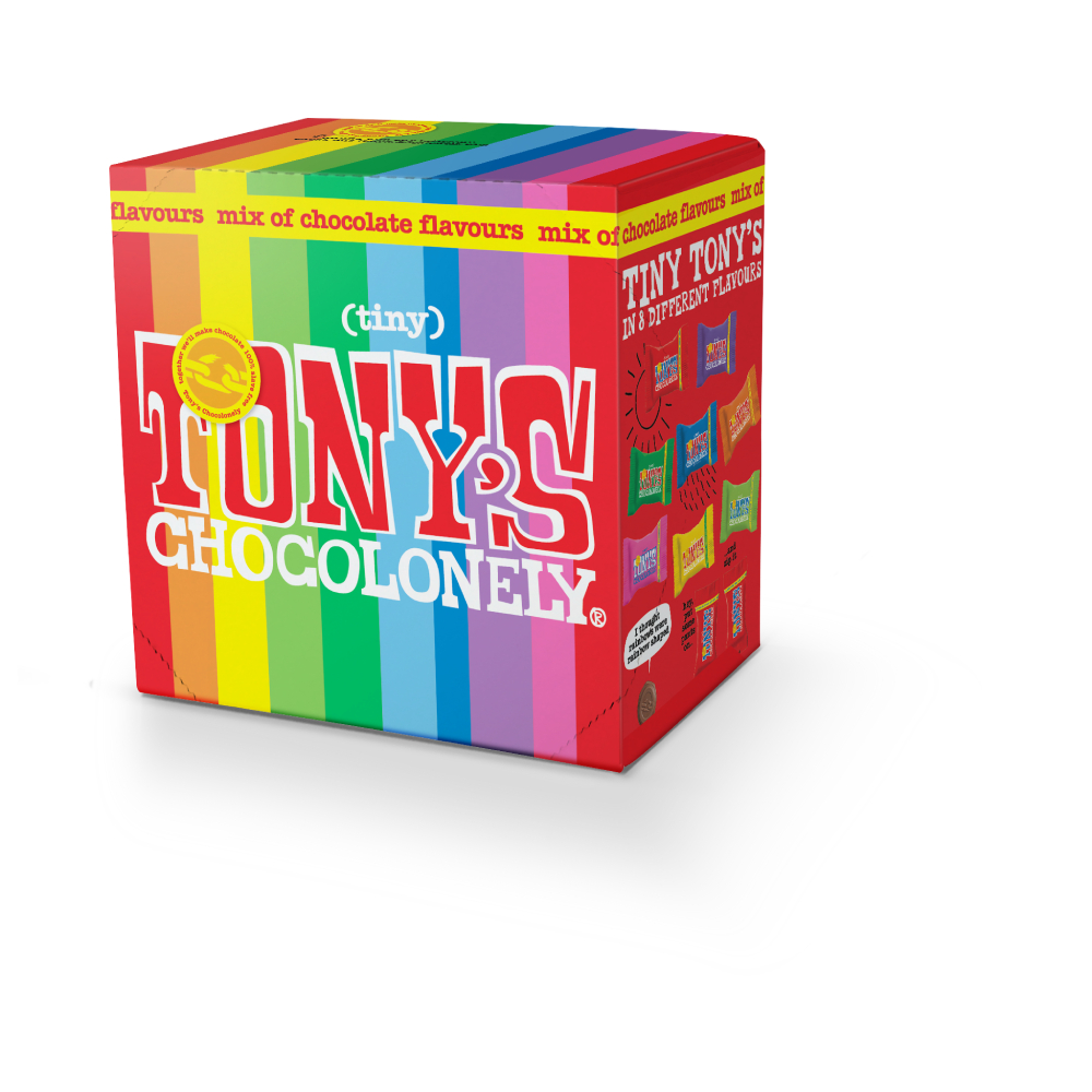 Now tiny Tony’s are even more shareable in this rainbow gift box. Who will you share your tiny snack moments with? It contains 20 tiny Tony’s in 8 classic Tony’s Chocolonely flavours: • Milk chocolate. • Milk caramel sea salt. • Milk almond honey nougat. • Milk hazelnut dark milk pretzel toffee. • Dark almond sea salt. • Dark chocolate. • White raspberry popping candy.