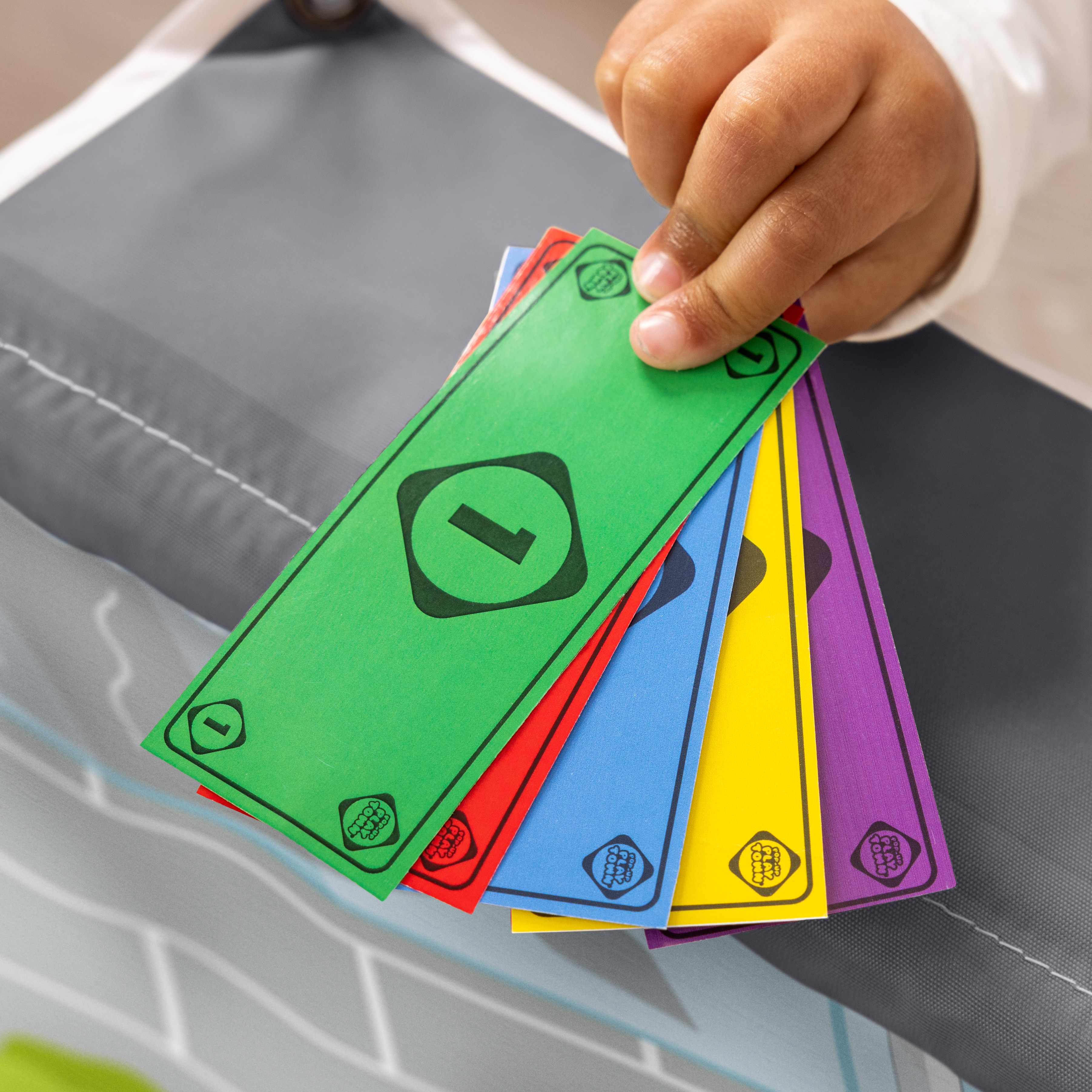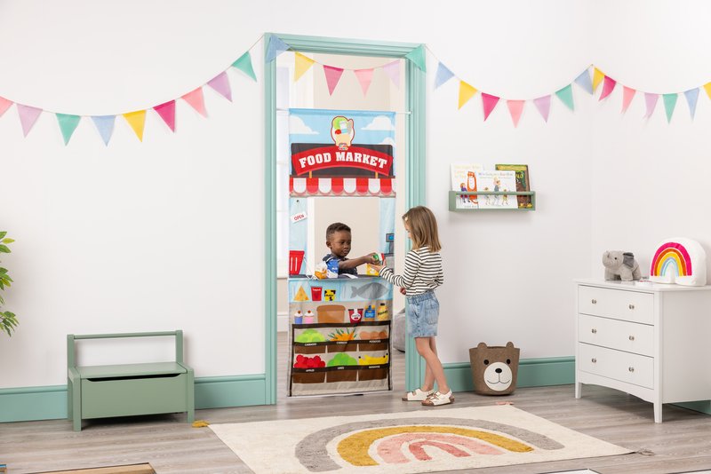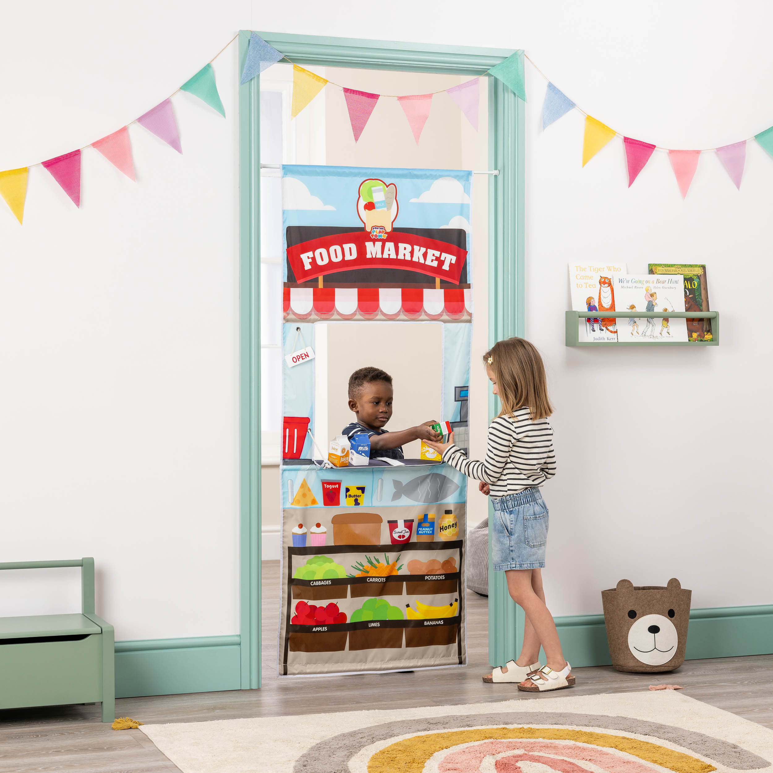 Let imaginations run wild with the Toyrific Food Market Role Play Curtain. Transform any door into a bustling food market with this role play curtain. With an extendable rod, it easily fits any standard UK door frames, bringing endless role play fun to the home. With two printed card food boxes and a fold up shelf, the Play Curtain is ideal for encouraging imaginative play for ages 3-8 years. Teach vital skills such as counting within their pretend play with the included play money. When playtime is over, simply remove the rod and roll up the curtain for easy storage.