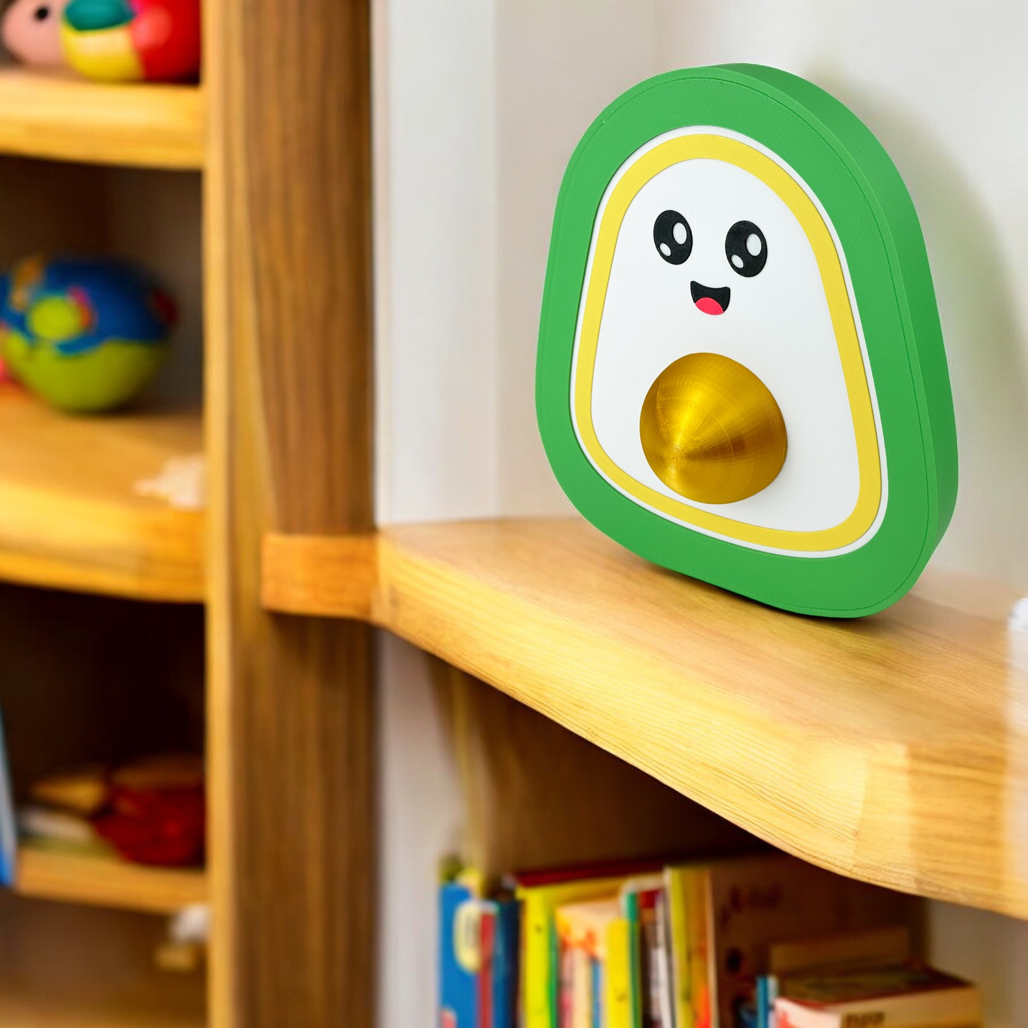 Add a touch of fun to your child's room with our Avocado Shaped LED Lightbox! Featuring a cheerful smiley face and a golden seed at its centre, this delightful lightbox is perfect for creating a cosy atmosphere at bedtime or as a decorative piece. Designed with child-safe, durable materials, it emits a soft, soothing glow that makes it ideal as a night light. A charming addition to any room or a unique gift idea, this avocado-shaped lightbox is sure to bring a smile to your little one's face!