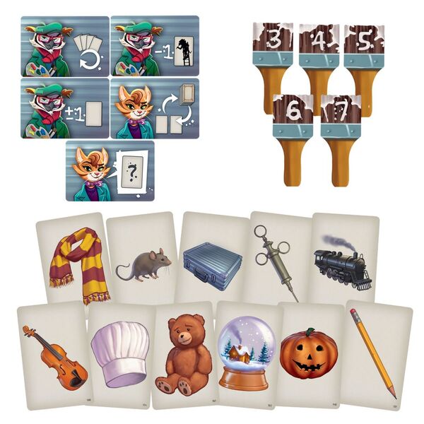 In this cooperative art-themed card game for three to seven players, there are two teams: painters and museum directors. At the start of the game, the museum directors present two cards, each with a picture that represents a visual theme that they have chosen for an upcoming museum exhibition. Next, the painters place some matching picture cards from their hand face down. Four more cards from the art forger Belratti are now secretly added to the deck of cards. The museum directors have to guess which picture cards the painters have submitted for the exhibition and which are forgeries. Will Belratti fool them all? 192 picture cards with many possible visual associations make it a fun challenge to catch the art forger in this family game.