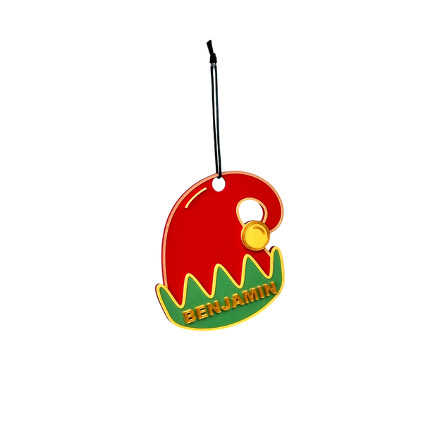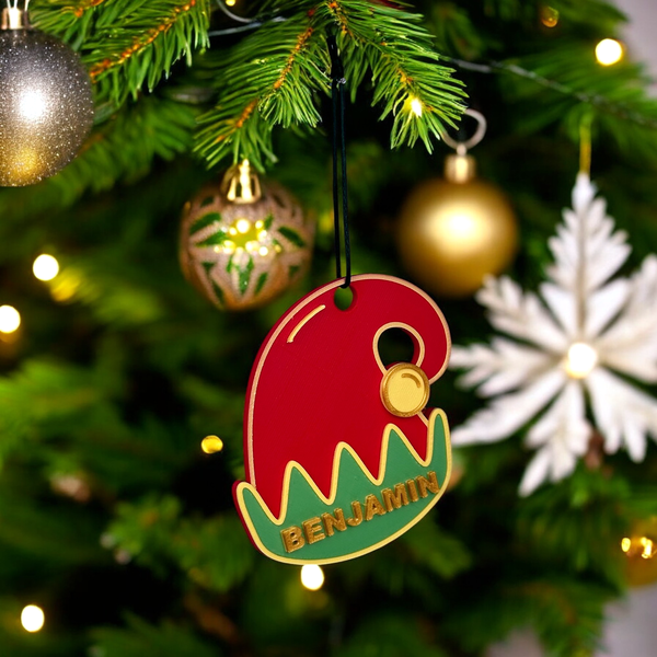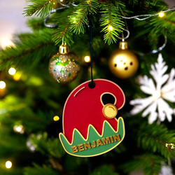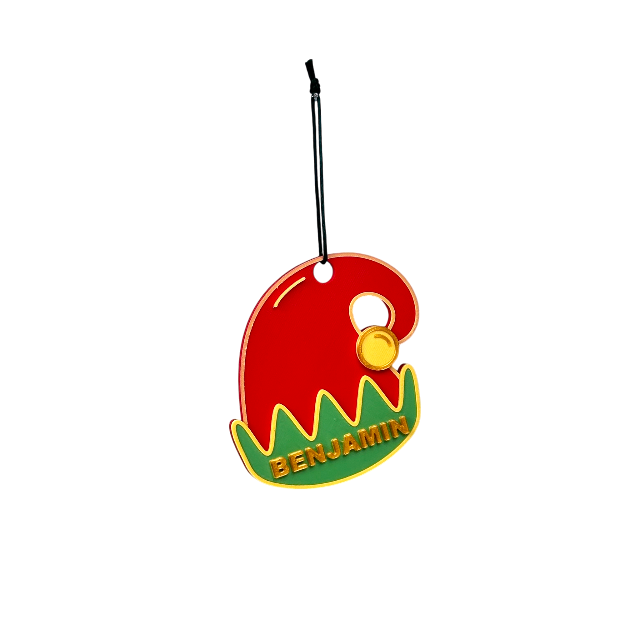 with our personalised elf hat ornament! Custom-made from eco-friendly, plant-based plastic, this charming decoration features a classic elf hat shape and can be customised with a name of your choice. It’s perfect for adding a personal touch to your holiday décor or gifting to someone special. Each ornament comes with string, ready to hang, and is crafted right here in the UK, ensuring both quality and sustainability.