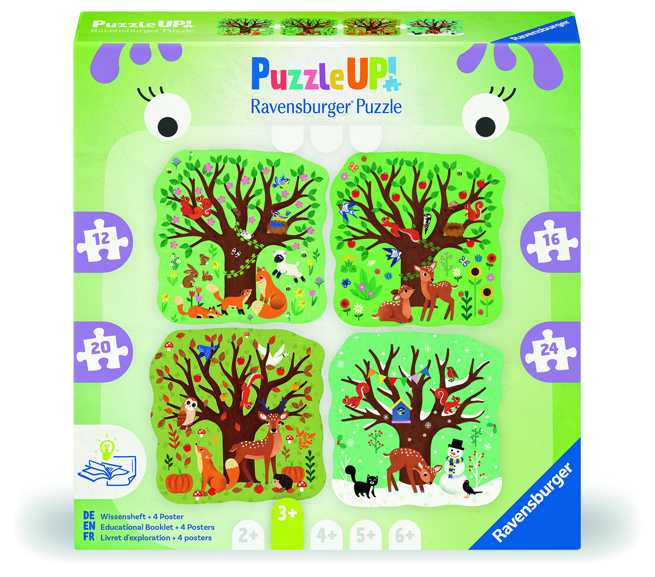 There are four puzzles inside the box showcasing the four seasons. The puzzles increase in piece count and there are talking and learning points included too. Puzzles are 12, 16, 20 and 24 pc. Suitable from age 3+ Please see our press release section for our Positively Puzzling puzzles and wellbeing info.