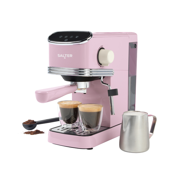 SINGLE OR DOUBLE: Looking to create barista-style drinks from the comfort of your home? This Salter Retro Espresso Machine is compatible with ground coffee and offers a single or double shot function. PROFESSIONAL 20-BAR PUMP: Thanks to the professional 20-bar Italian pressure pump and the 1350W motor, this coffee machine offers powerful extraction and is equipped with a 1.35 litre water tank for less frequent refills. MILK FROTHER: Channel your inner barista using the convenient milk frothing wand, perfect for making creamy or foamy textured milk to create your own unique foam art. DIGITAL LED DISPLAY: Enjoy coffee at the touch of a button! Thanks to the touch-control digital LED display, you can control the power and select from up to 4 various settings. ACCESSORIES INCLUDED: Equipped with a coffee measuring spoon, tamper, portafilter, and a stainless-steel milk jug, this espresso machine includes all the essential accessories to create your favourite hot drinks! Add a chic touch to your kitchen décor with the Salter Retro collection. Offering a variety of Kettle & Toaster Sets, this range boasts a vintage-inspired design in a baby pink or grey colourway.