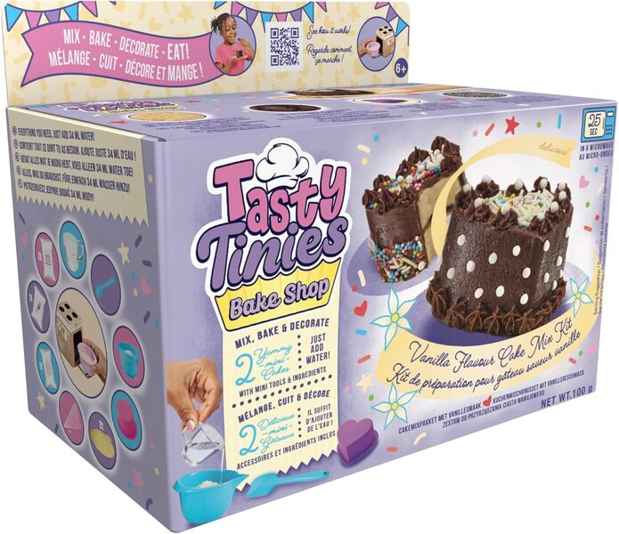 Create tiny treats with BIG flavors in just 25 seconds! Tasty Tinies Bake Shop Cake Mix Kits use microwave magic to bake mini cakes. Each kit includes cake mix, frosting, sprinkles, and all the tiny tools you need — just add water! Kids will love mixing, pouring, baking, decorating, and eating. Try chocolate, vanilla, strawberry and more! Recommended for ages 6+.