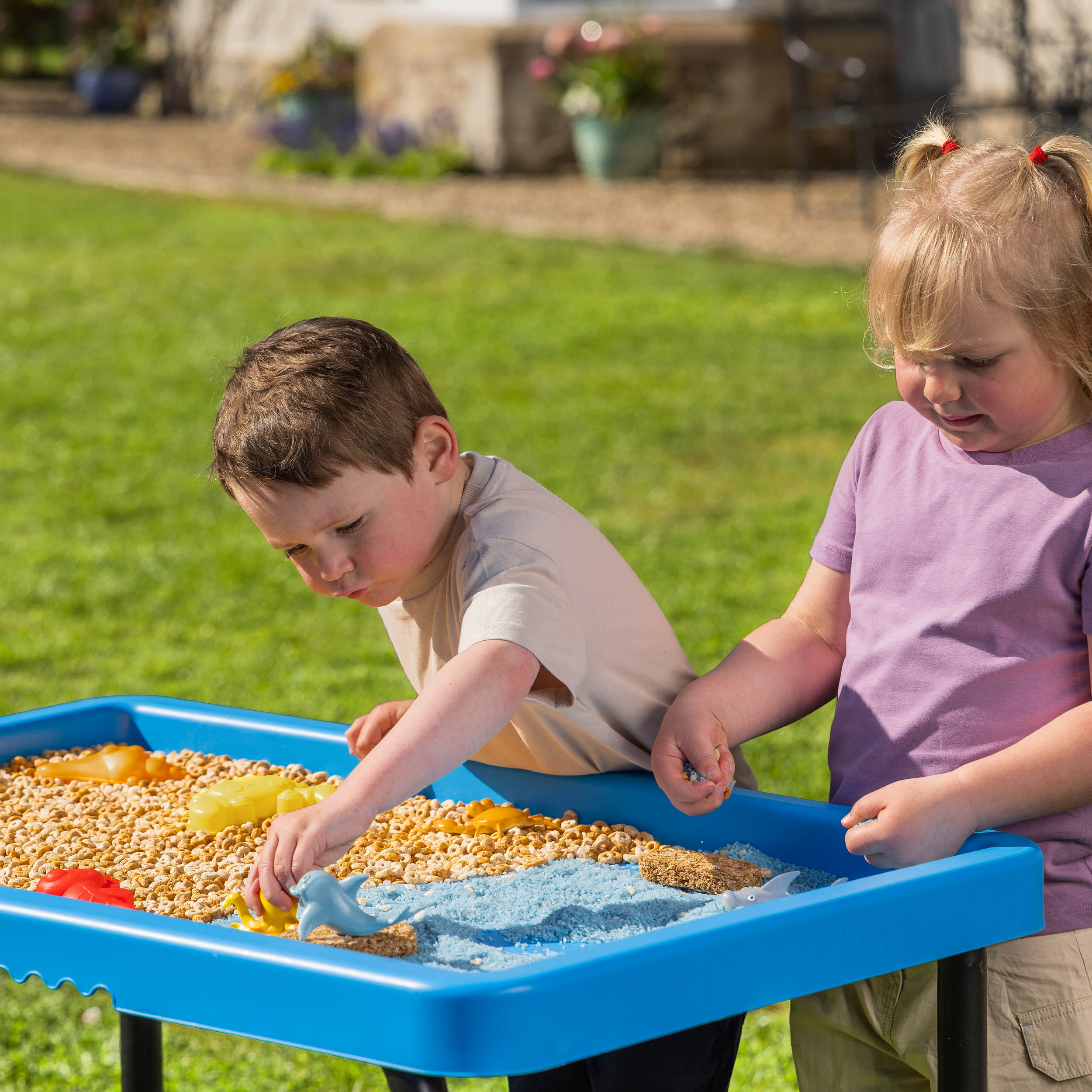 The Play Tray is a versatile activity table designed for children to be creative with messy play in a contained area. A hub for creativity! The table has adjustable legs, which grow with your child adapting to their height. It's perfect for indoor and outdoor use, making it the ideal companion for all your little one's learning and sensory activities. Designed to easily fit through standard UK doors and equipped with lifted and rounded edges, the tray is simple to pick up and move. Its removable legs add versatility and make it ideal for saving space. Made from food grade plastic, the Play Tray is safe for food based messy play and the handy pouring corner makes clean up super easy. Whether it's art, craft, snack time, or outdoor exploration, the Toyrific Play Tray activity table is ready to be the canvas for your child's imagination.