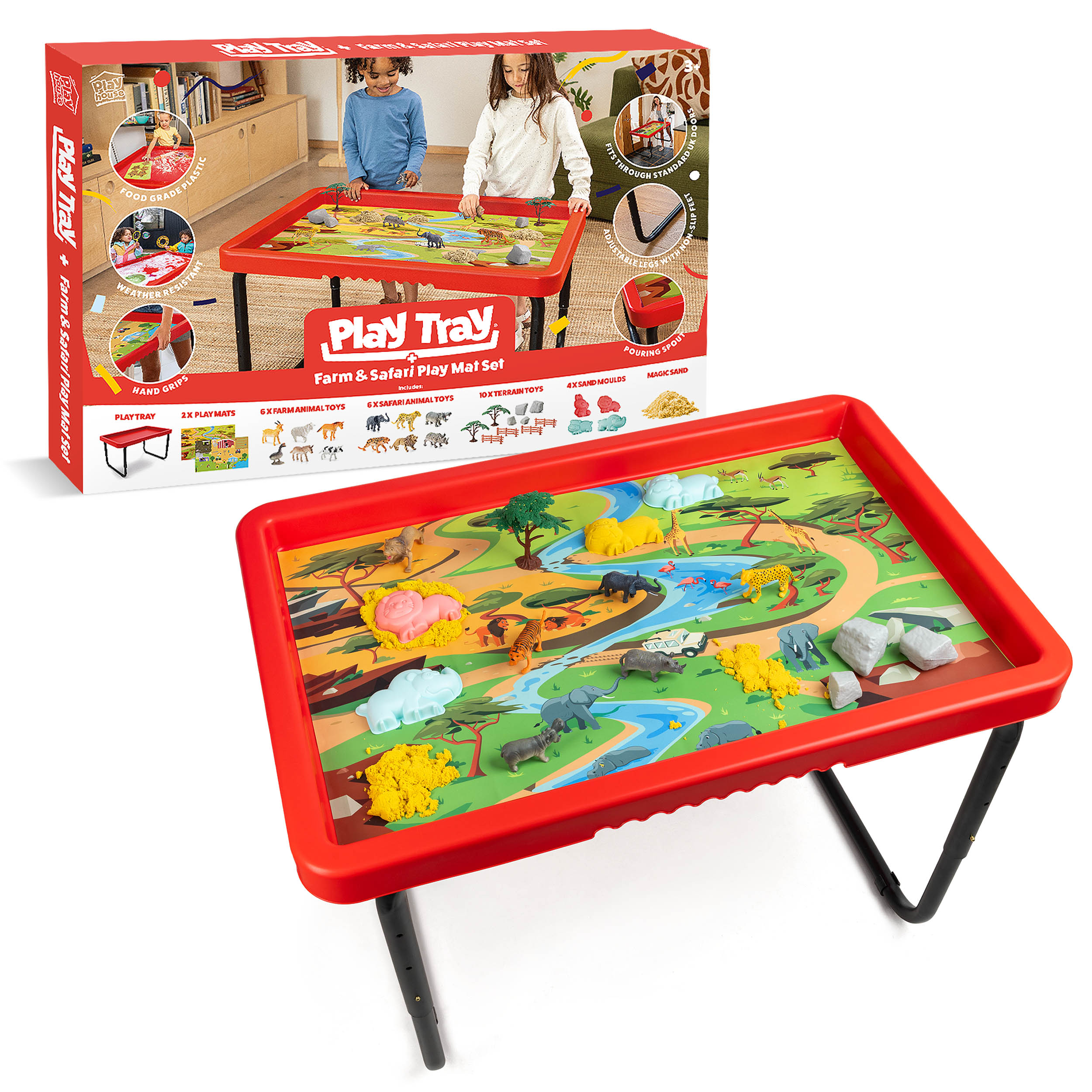 The Toyrific Play Tray Farm & Safari Set is the ultimate playtime companion, designed to captivate children’s imaginations while offering hours of engaging, hands-on fun! Whether they’re creating animal adventures on the safari plains or tending to life on the farm, this versatile play tray transforms any space into a vibrant, creative world of exploration. Crafted from food-grade plastic, the tray is both durable and child-safe, making it perfect for little hands and big imaginations. Its thoughtful design includes powder-coated removable metal legs with three adjustable height options, allowing it to grow with your child or adapt to various play setups. To protect delicate surfaces, the tray features a textured underside that prevents scratches, while easy-lift hand grips make moving the tray between indoor and outdoor settings effortless. This well-considered design prioritises convenience, portability, and mess-free fun, making it an ideal addition to any playroom or family space. The Play Tray Farm & Safari Set comes packed with everything needed to jump straight into imaginative play. The set includes 500g of Magic Sand, which is perfect for sculpting, shaping, and creating realistic landscapes for both the safari and farm animals. Children can use their creativity to mould terrain, build enclosures, or fashion tracks using the included sand moulds. Featuring two detailed play mats one for the safari and one for the farm.