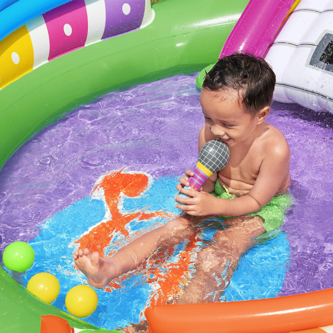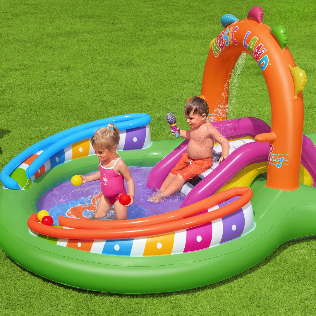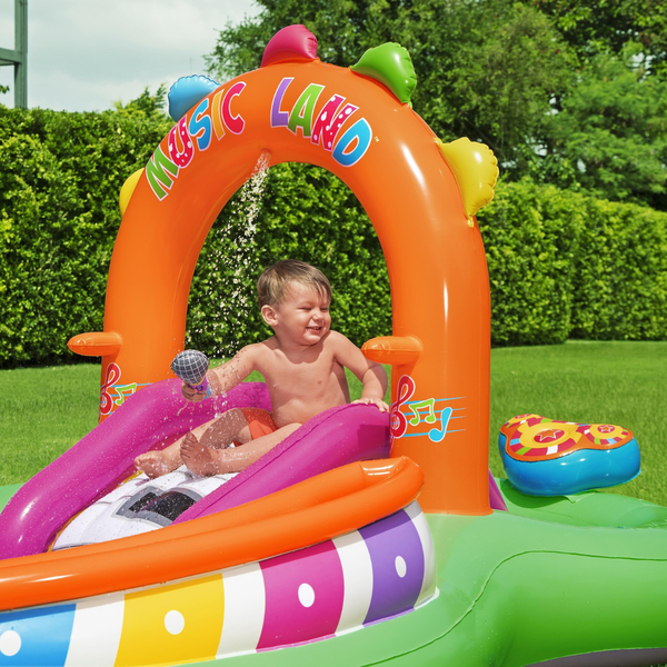 Rock out this summer with the Bestway® Sing 'N' Splash Play Centre! Kids can explore their musical side and splash in the sun with the extensive play features and all the inflatable musical instruments. This play centre includes a microphone and a drum for kids to play with, inspiring them to use their imagination. The double pools provide multiple play areas and are connected by a removable slide. The pool floor has an inflatable landing cushion for extra comfort when kids slide down. The play centre's arch features a sprinkler that soaks both kids and the slide, and it also has a fun ring toss game for kids to play. Kids can also roll the included play balls down each of the two tracks along the outside of the play centre, allowing them to have lots of fun while working on developing hand-eye coordination and dexterity. Simply attach a garden hose to get the fun started!