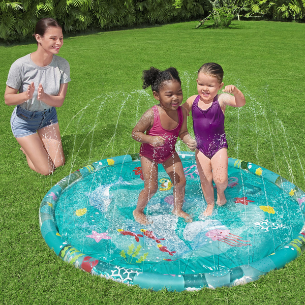 The Bestway® Underwater Splash Pad is redefining garden fun. Big and little kids alike will love the shallow splash pool created with the inflatable rim that surrounds the pad and traps the water for frolicking, splashing fun. Get ready to dance beneath a cascade of cool water! Just hook up your garden hose to create the gentle streams that will not only inspire play and imagination, but also keep everyone cool under the warm summer sun. Jump, splash or wade in the water as you wiggle and dance beneath the sprinklers that aim towards the centre of the pad, creating a fun fountain effect. Kids will be captivated by the attractive marine-life print, and parents will enjoy the easy set-up and safe water play. Everyone will find something to enjoy with this exciting Underwater Splash Pad.