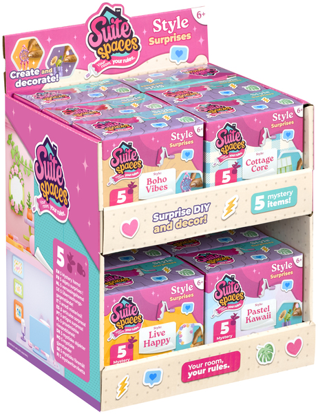 Suite Spaces allows children to build, decorate, and customise a dollhouse, completely from scratch. Transform the space with buildable pieces and magic reveals and unleash creativity with this fully modular system by connecting connect multiple rooms together and mix-and-match accessories to make a full dollhouse. With 5 surprises in each box, give your Suite Spaces rooms extra decor to bring them to life! Style Surprises come in 4 signature styles: Boho Vibes, Cottage Core, Live Happy, and Pastel Kawaii.