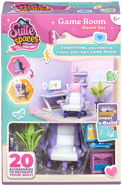 Suite Spaces allows children to build, decorate, and customise a dollhouse, completely from scratch. Transform the space with buildable pieces and magic reveals and unleash creativity with this fully modular system by connecting connect multiple rooms together and mix-and-match accessories to make a full dollhouse. The Suite Spaces Gamer Living Room Pack has all of the gaming room accessories you need, including walls, a rotating gamer chair, glow-in-the-dark wall decos and more.‚Äã