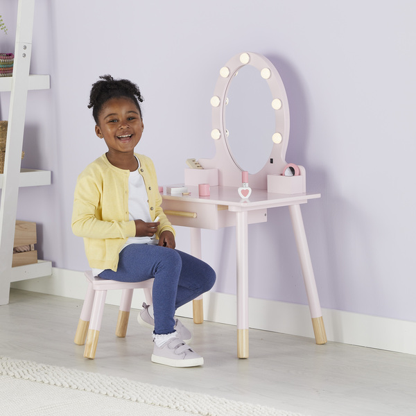 Light Up Wooden Vanity with drawer and matching stool Kids pink vanity table with round mirror and light bulbs Includes storage for all your dress up accessories!