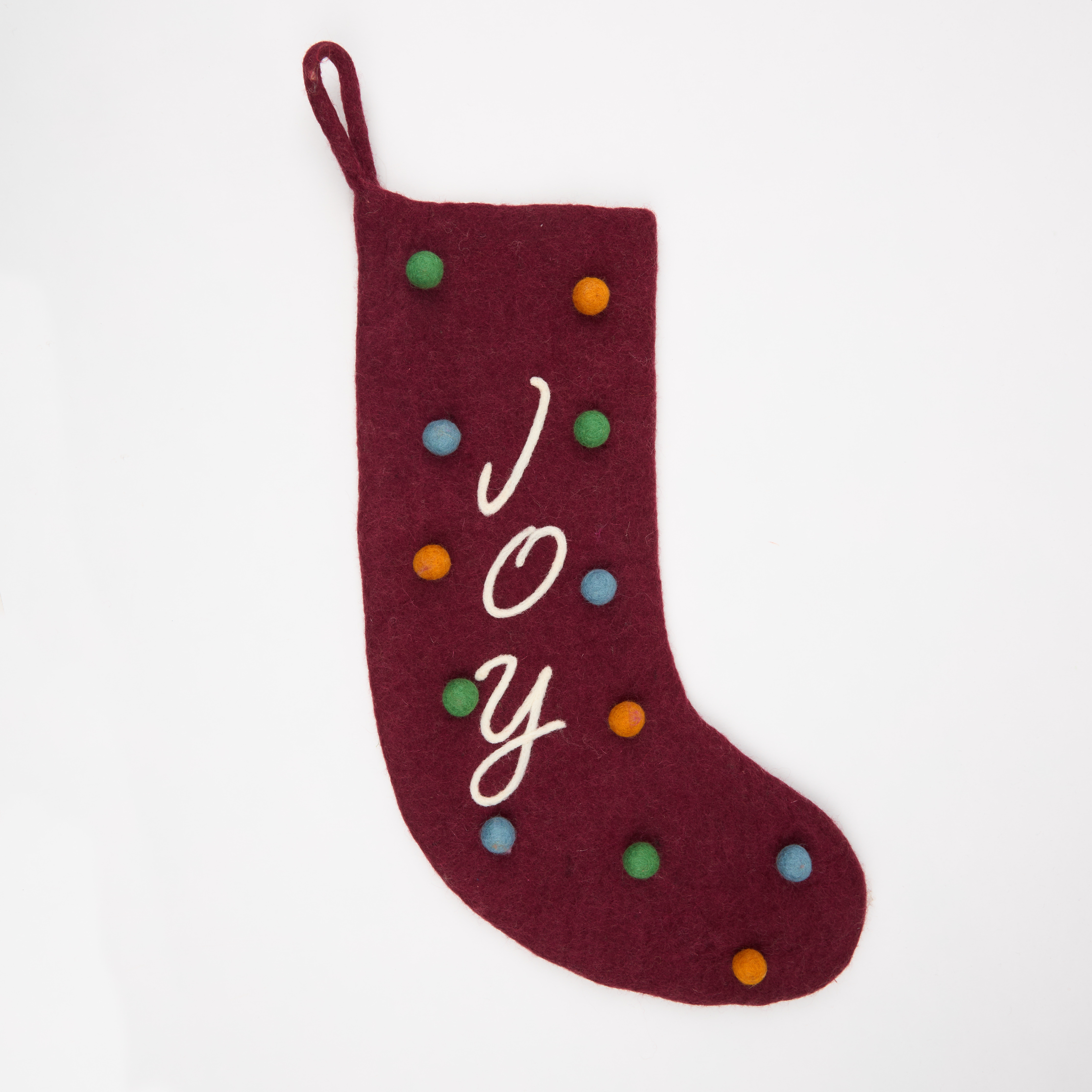 Celebrate the holidays with this Joy Polka Dot Felt Stocking that has been lovingly handmade by artisans in Nepal. Hang around your home for the perfect inviting addition to your festive decorations or use to share a small gift to a loved one. Dimensions: H 550 mm x W 300 mm x D 12 mm Handmade in Nepal.