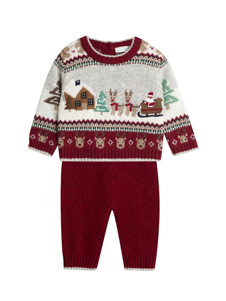 Halls decked with holly, now it s time to get merry and jolly in this Burgundy Red 2-Piece Christmas Fair Isle Jumper & Leggings Set! Perfect for wearing throughout the Christmas season, little ones will love getting involved in all the festive fun whilst keeping snug and cosy in all-day comfort thanks to the soft knitted material. Featuring a snowy Christmas scene, little merry-makers will love spotting Santa and his reindeer through the village across the front and the contrasting edges on the hems and neckline add an extra pop, so little ones will be ready for first visits to Santa, Christmas market wanders and beyond.