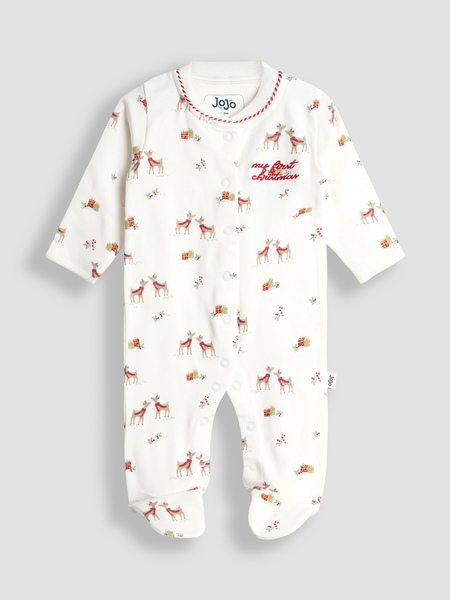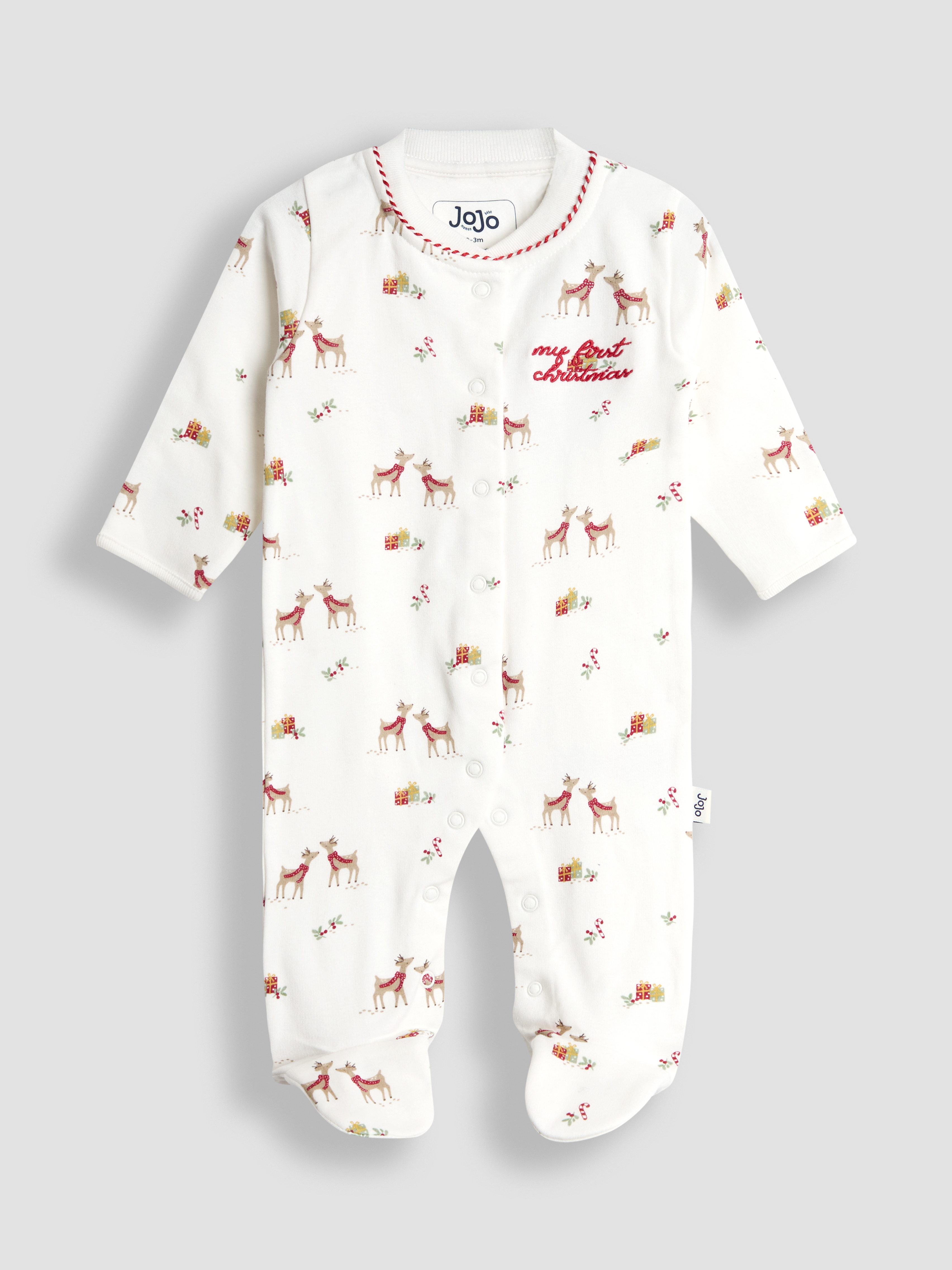 Keywords Christmas , Cream , Embroidered , Mother And Baby , My First Christmas , New Baby , Reindeer , Sleepsuit , White