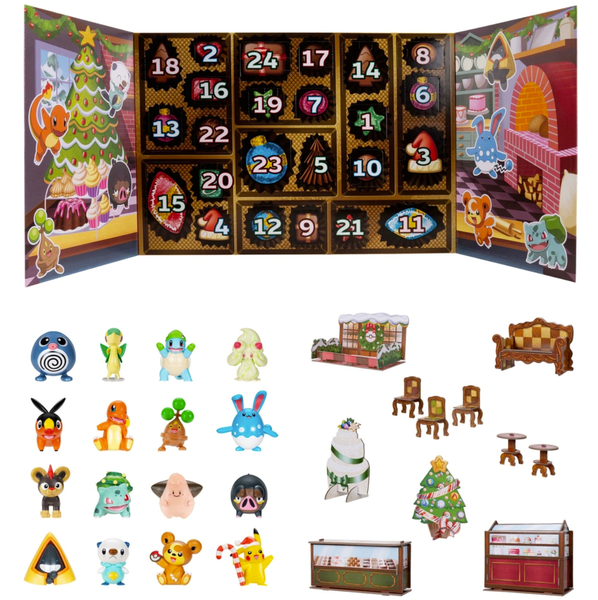 Countdown the festive season with Pokémon Battle Figures! The Pokémon Holiday Advent Calendar 2025 features 16 battle figures with exclusive special finishes, including unique holiday-themed figures. Unbox a new Pokémon surprise every day, including themed play accessories for extra holiday fun! Discover iconic 5cm characters, including holiday-themed Pikachu, Squirtle, Bulbasaur and Teddiursa! With 24 days of unboxing fun, you'll also reveal standard Pokémon battle figures of Poliwag, Snivy, Alcremie, Tepig, Charmander, Bonsly, Azumarill, Litleo, Cleffa, Lechonk, Snorunt and Oshawott! Discover 16 Battle Figures and 8 holiday-themed accessories, and reveal a new Pokémon gift each day. With exclusive battle figures and special finishes, celebrate the festive season with the Pokémon!