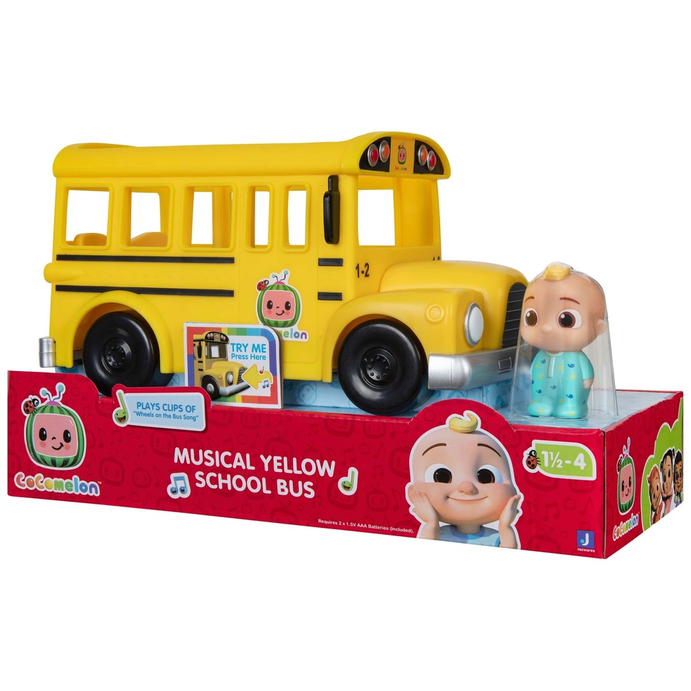 Watch your child sing and play with the CoComelon Musical Yellow School Bus with J.J figure! This brightly coloured bus includes a J.J figure and plays “Wheels on the Bus” when you press the front—perfect for sing-along fun.