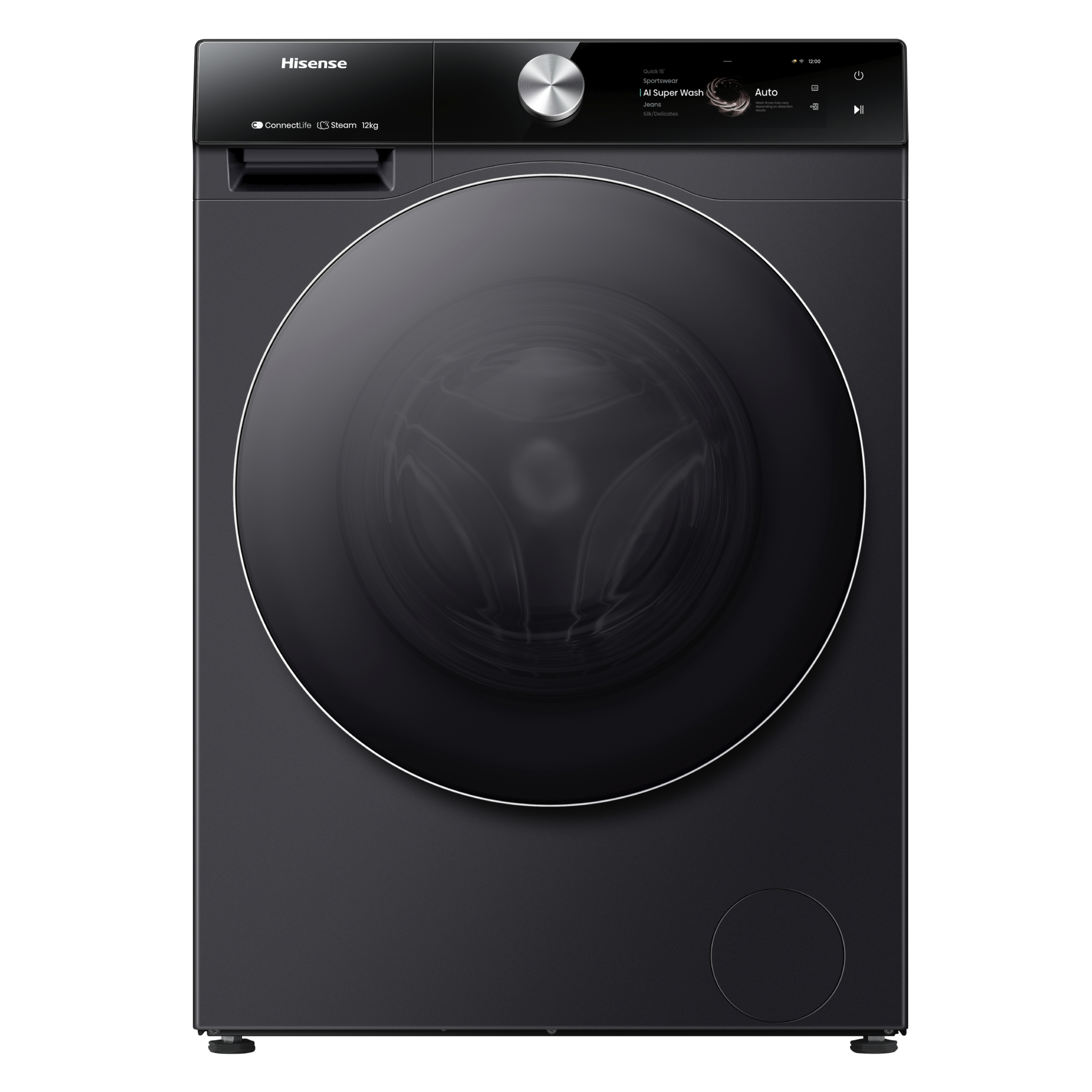 The Hisense WF7S1247BB is a spacious 12kg front‑loading washing machine designed for large households. It features an Inverter PowerDrive motor for quieter operation and energy efficiency. The machine offers 20 wash programs, including options for cotton, synthetics, wool, sportswear, and everyday loads. Notably, it includes a Quick Wash cycle that cleans 1.5kg of laundry in just 15 minutes, ideal for busy schedules. The Auto Dosing System automatically dispenses the optimal amount of detergent and softener for each load, reducing waste and ensuring effective cleaning. Additionally, the Steam Wash function helps to reduce allergens and wrinkles in your laundry. With Wi-Fi connectivity, you can control and monitor the washing machine remotely via the ConnectLife app. Its sleek black design and LCD display add a modern touch to your laundry room. Operating at a 70 dB noise level during spinning, it provides a relatively quiet washing experience. The machine's dimensions are 59.5 cm (W) × 84.5 cm (H) × 64 cm (D), making it suitable for most standard laundry spaces. With an A energy rating, it offers efficient performance while helping to reduce energy consumption.