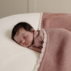 Cocoon your little one in comfort with our Rose Scallop Tipped Baby Blanket. Our soft dusky rose garter stitch is a masterpiece of simplicity and sophistication. Crafted with a beautiful oat scalloped trim, this blanket is the ultimate newborn gift, capturing the heart with it's romantic charm. Knitted in GOTS-certified organic cotton, this blanket is not only exceptionally soft and gentle on delicate newborn skin but is also breathable and thermoregulating, ensuring optimal comfort in any season. Our Blankets have earned 15 industry awards, including the prestigious Platinum for 'Best Baby Blanket' in both The Organic Baby Awards 2025 & The Essential Baby Awards 2025. These accolades attest to the quality and craftsmanship that define our products.