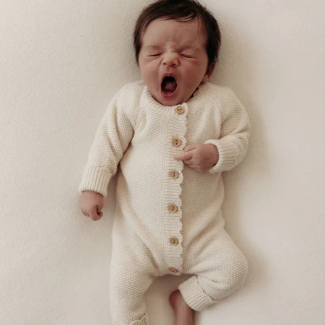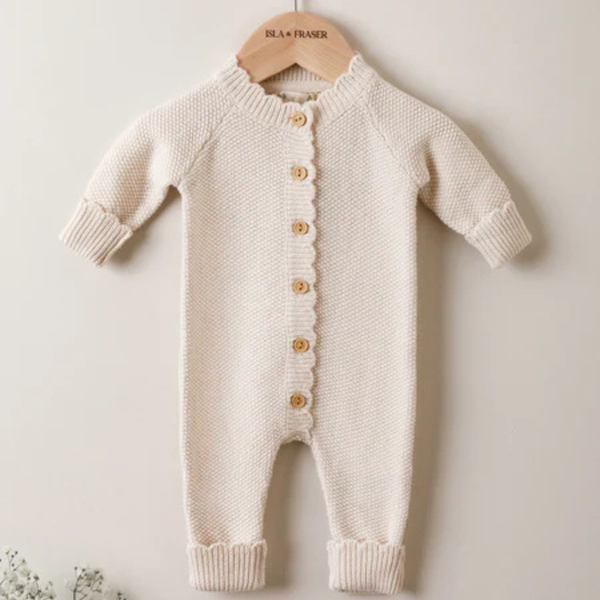 Knitted in exceptionally soft organic cotton, our Oat Moss Stitch Baby Romper boasts a lovely gentle stretch for ultimate comfort. Adorned with our signature scalloped trim, this charming romper features beautifully designed fold-over cuffs at the hands and feet, providing extra room for your little one to grow. Our baby knitwear won the Platinum Award for 'Best Organic Clothing Brand' in the 2025 Organic Baby Awards.