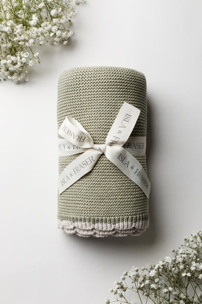 Cocoon your little one in comfort with our Sage Scallop Tipped Baby Blanket. Our soft sage garter stitch is a beautiful blend of simplicity and sophistication. Crafted with our signature scallop trim, tipped with a complimentary light oat border, this blanket is the ultimate newborn gift. Knitted in GOTS-certified organic cotton, this blanket is not only exceptionally soft and gentle on delicate newborn skin but is also breathable and thermoregulating, ensuring optimal comfort in any season. Our Blankets have earned 15 industry awards, including the prestigious Platinum for 'Best Baby Blanket' in both The Organic Baby Awards 2025 & The Essential Baby Awards 2025. These accolades attest to the quality and craftsmanship that define our products.