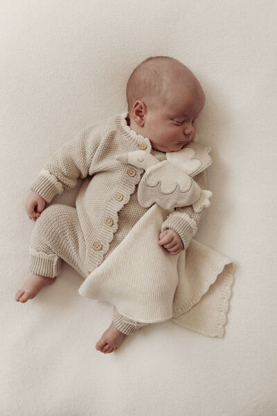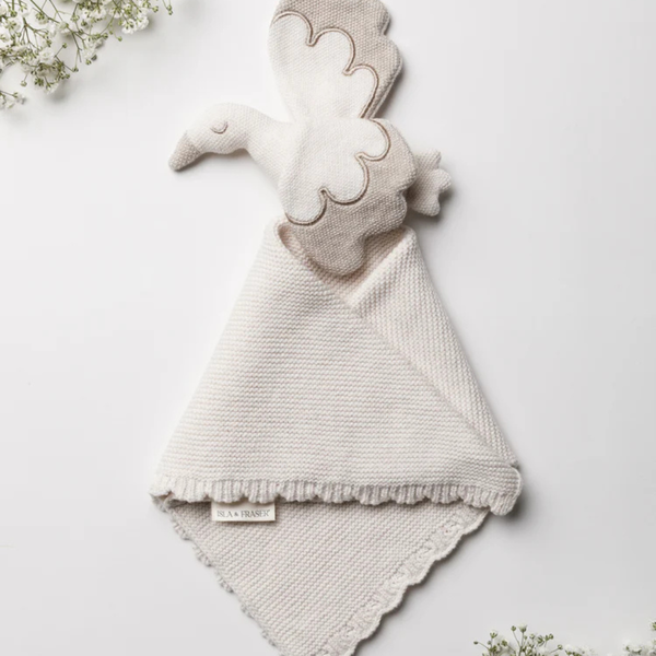 Crafted with the utmost care, this luxury baby gift was hand-sketched based on our iconic Isla and Fraser logo, and is knitted in our exceptionally soft organic cotton. Our stork comforters feature our signature oat melange scalloped blanket detail combined with pebble grey scalloped wing detail. Pebble embroidery is used for our sleepy eye detail and to accentuate the beautiful scalloping on the wings. Our Isla & Fraser Stork makes a thoughtful new baby gift and is destined to become your little one's cherished companion.