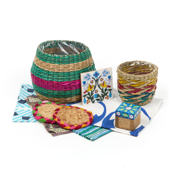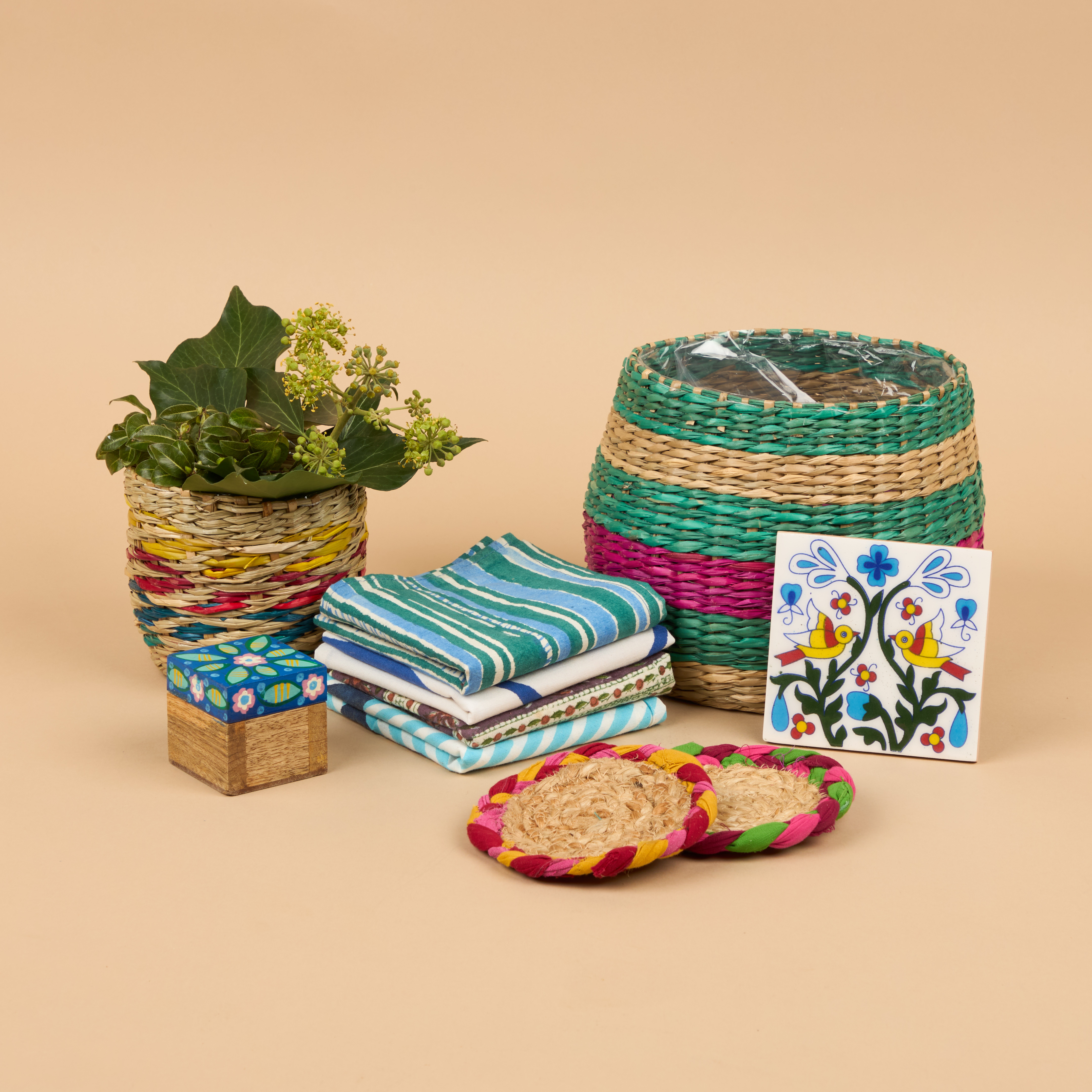 A carefully curated homeware bundle featuring everyday essentials to add finishing touches to your home. This bundle includes napkins, planters, coasters and gift box — perfect for everyday use or setting up your first home. In this bundle you will receive: • Mismatched Cotton Napkins Large: Set of 4 block printed patterned napkins. These napkins have been created using one of the earliest methods of textile printing and require great patience to yield such artistic results. Beautifully handmade using engraved wooden blocks coated in dye to stamp the design on to the cotton, these napkins are a wonderfully unique piece to add to your home, or perfect as a housewarming gift. Please note; Each napkin set is beautifully unique. Patterns and colours will vary. Dimensions: H 500 mm x W 500 mm. Materials: Cotton 99%, Dyes 1%. Handmade in India • Handmade Multicolour Seagrass Mini Planter: This mini handwoven seagrass planter brings natural texture and warmth to your home. Its lightweight yet sturdy design makes it perfect for showcasing houseplants, while the neutral tones complement any décor style. These planters have a plastic lining to prevent spills. Please note; Each planter is beautifully unique. Patterns and colours will vary Dimensions: H 100mm x W 100mm x D 100mm. Materials: Seagrass basket, water paint, plastic sheet lining. Handmade in Vietnam • Handmade Multicolour Stripe Seagrass Planter - Large: This large handwoven seagrass planter brings natural texture and