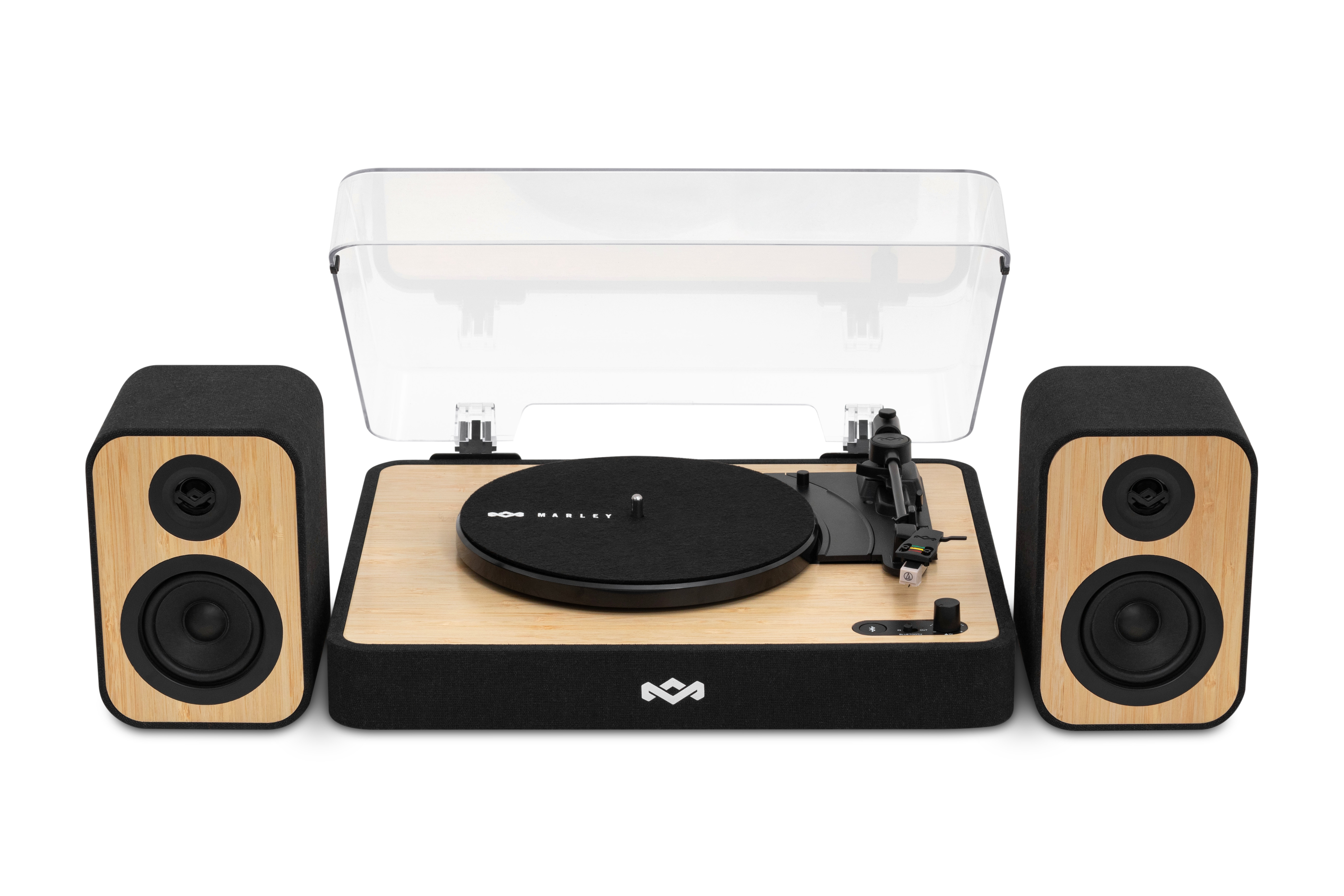 Discover the Revolution Turntable and Speakers sound system. With an Audio-Technica stylus, sleek dust cover, felt mat, pre-calibrated tracking force, and anti-skate, this Bluetooth® turntable is simple to use and enjoy. It has a built-in dust cover for minimal maintenance and two bookshelf speakers. Made with sustainable materials like bamboo, REWIND™ fabric, and post-consumer plastics, this setup offers the highest-quality sound and aesthetic.