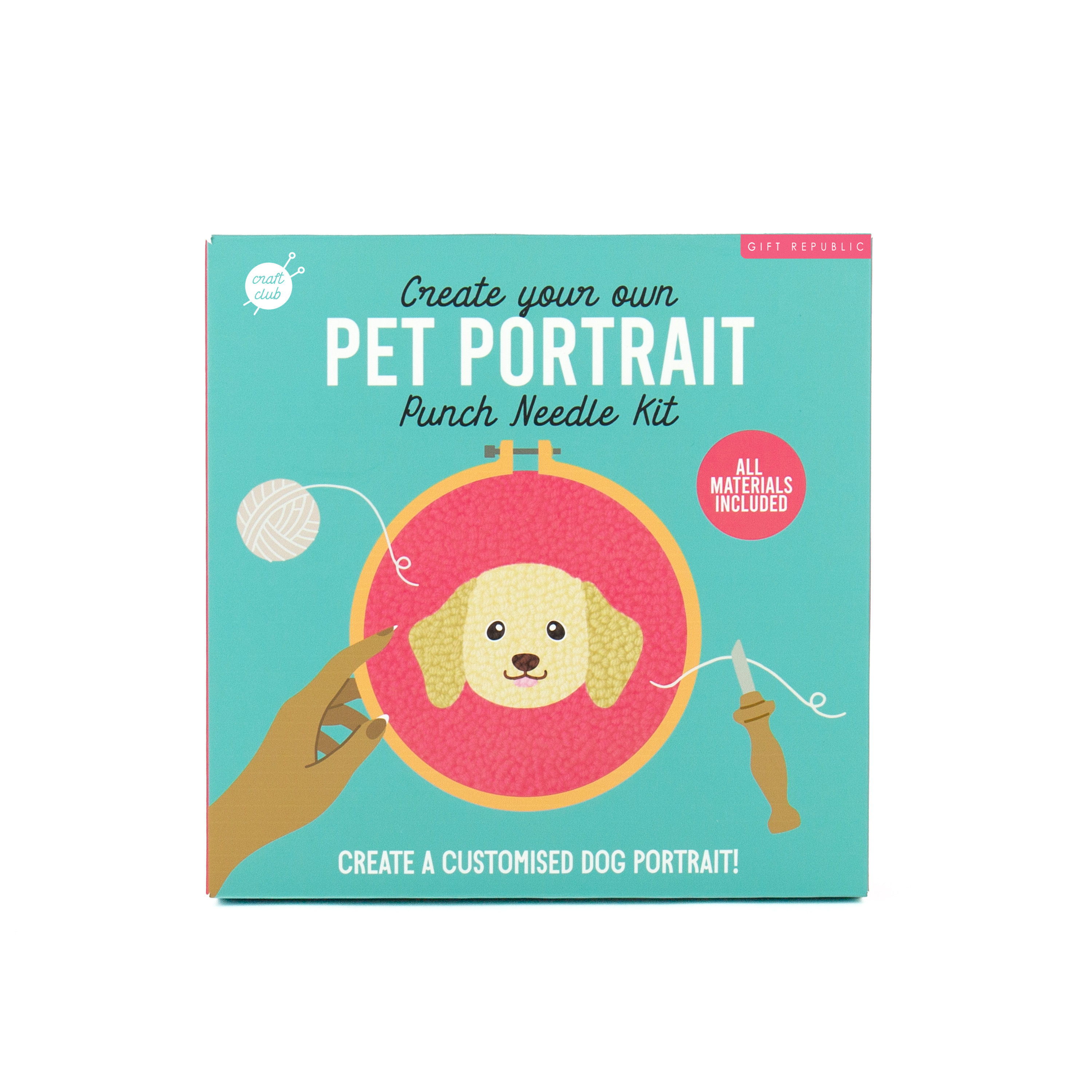 Create a personalised punch needle portrait of your dog with this complete DIY kit, perfect for pet lovers and craft enthusiasts. Designed for older kids, teens, and adults, this kit is a fun introduction to punch needle crafting, suitable for beginners and experienced crafters. Comes with 8 coloured wool balls, an embroidery ring, fabric, a punch needle hook, and full instructions to get you started right away. The variety of colours allows you to create a design that suits your own furry friend best and captures their individual features. Made with premium needle crafting supplies, ensuring a durable and satisfying crafting experience. The fun kit allows you to express your creativity and generate a lasting portrait of your precious pet. Dimensions: H 180 mm x W 180 mm x D 55 mm