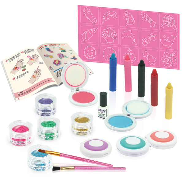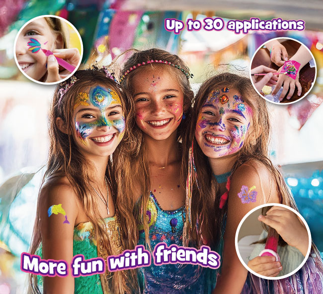 Bring colour, sparkle, and creativity to any party! This all-in-one makeover kit includes stencils, eco-friendly glitter, brushes, hair chalk compacts, and washable face paints — everything kids need for hours of imaginative fun. Perfect for birthdays, festivals, or just a rainy-day activity. Why You'll Love It: Complete party makeover kit (tattoos, hair chalk, face paint) Safe, washable, eco-friendly materials Encourages creativity, roleplay, and self-expression Easy to use — no mess, no fuss Great for parties, festivals, or everyday fun