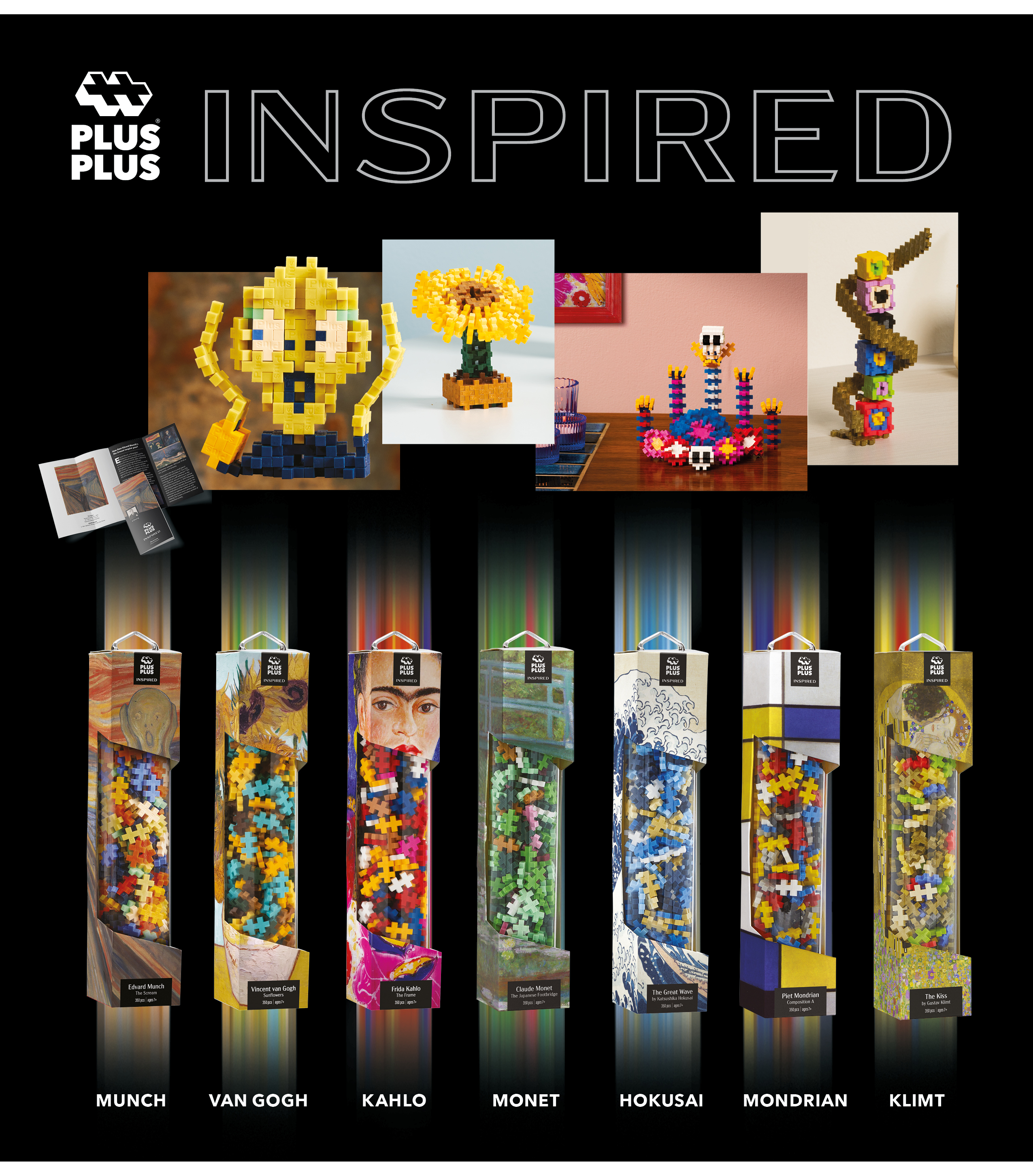 Observe, admire and create your own amazing creations using the one-shape, curated colour palette inspired by your favourite artists. Award winning Plus-Plus originated in the 1980s in Denmark. Recognized for embracing the concept of open-ended play and deep rooted in Danish heritage, quality and design. With a singular shape available in a world of colourful pieces, by connecting pieces together , anyone can be inspired to create whatever their imagination desires in 2D and 3D, helping to develop fine motor skills, patience and dexterity by playing and learning to build. Each tube contains 350piecs of Plus-Plus , stored in a reusable, display quality tube inside a recyclable gift box package. Also included is an educational and inspirational flyer about the artist's life and their work.. Perfect for museums, art establishments, book and gift shops, Plus-Plus Inspired lets budding artists and art enthusiasts experiment with colours and designs to reflect these classic works of art or to create their own designs., to experiment and display with colour. There are currently seven to choose from - Klimt "The Kiss", Mondrian "Composition A", Hokusai "The Great Wave", Monet " The Japanese Footbridge", Kahlo "The Frame", Van Gogh " Sunflowers", and Munch " The Scream". From January 2026, two new editions - the popular Van Gogh "Starry Night" and Van Gogh "Almond Blossom" - will join the range.