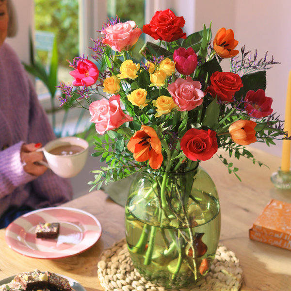 18 stems including roses, tulips, pistache and limonium. These tulips are grown in the UK, and we send with bulbs attached for added freshness. The best bit? The bulbs can be stored, replanted and enjoyed next spring.