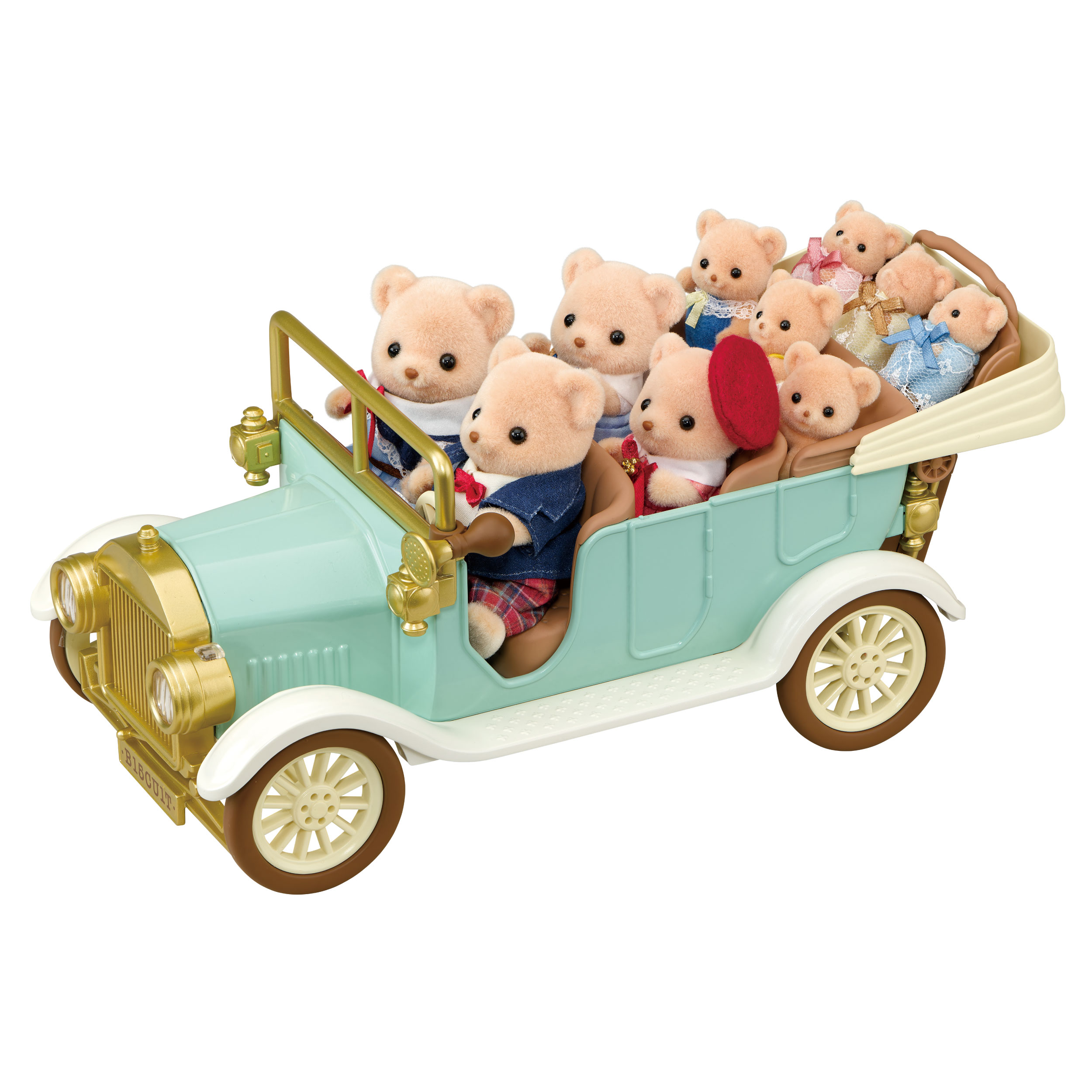 This timeless covertible car designed by the Biscuit Bear father, can seat up to 10 figures! Change the layout by turning the seats around and turn the headlights on and off - no batteries needed! Pack up the picnic accessories in the suitcase and attach it to the back of the car or transform the suitcase into a little table! The stroller can also be popped in the car as seats for the triplet babies! Age 3+. Available from August 2026