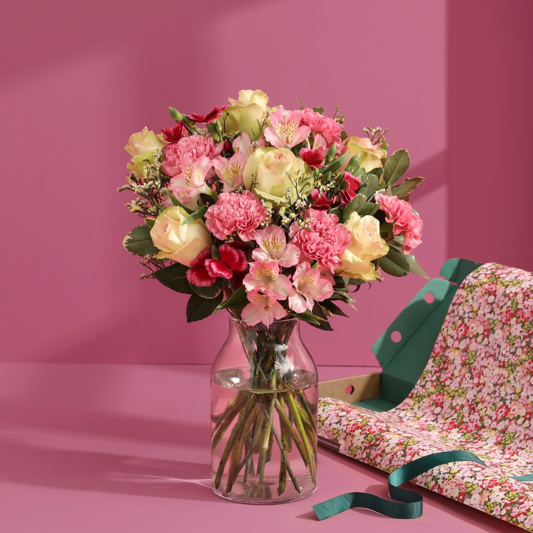 22 stems including roses, alstroemeria, carnations, sweet williams, pitto, greenbell and limonium. Arrives all dressed up in a limited edition Liberty print flower wrap