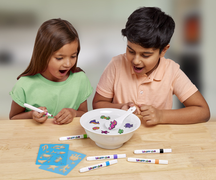 Make your own magical water creations with this unique and new crafting activity. So fun and easy to do! Use the stencils or your own imagination to colour the ceramic spoon then simply dip into water and watch the magic happen. This Sea Life theme includes six assorted magical water markers, two stencil sheets and a ceramic spoon. This fun sensory toy also promotes hand/eye coordination and encourages creativity and imagination. Amaze your friends and play with your creations. Magical, fun & challenging. Squiggle and create! Perfect for children who like magic and art! This set includes 6 assorted magical water markers, 2 stencil sheets & ceramic spoon
