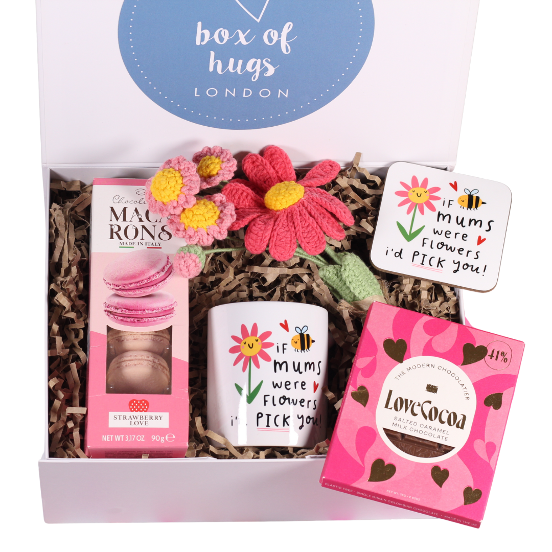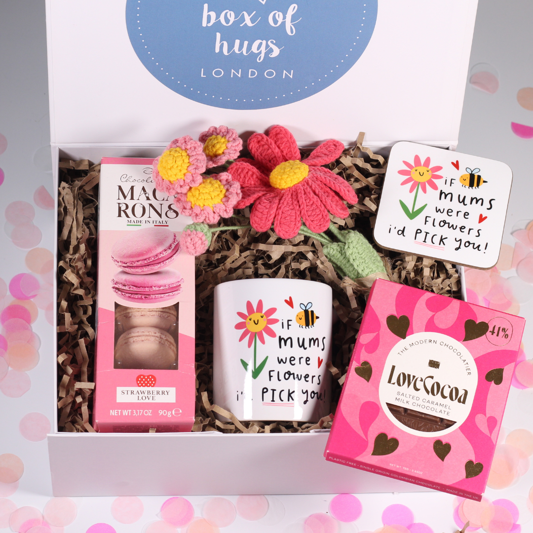 Created for those who love flowers but want something a little more thoughtful and long-lasting, the Mother's Day Box of Hugs is a cheerful, floral-inspired care package designed to make someone feel truly appreciated. Inspired by the simple sentiment of choosing your mum above all else, this gift combines the joy of receiving flowers with comforting treats and keepsakes that can be enjoyed long after the day itself. Inside the box is a gorgeous crochet flower posy, a matching illustrated mug, luxury Italian macarons, indulgent Love Cocoa chocolate and a heartfelt coaster featuring the message “If mums were flowers, I’d pick you.” Each item is carefully selected to make her feel extra special this Mother's Day. Perfect for Mother’s Day, birthdays, thank you gifts or “just because” moments, this box offers a meaningful alternative to traditional flowers.. Box of Hugs specialises in thoughtful, ready-to-send care packages that help people show love when they can’t be there in person. This product is ideal for Mother’s Day gift guides, alternative-to-flowers features, gifts for her round-ups, small business spotlights and modern, sentiment-led gifting stories.