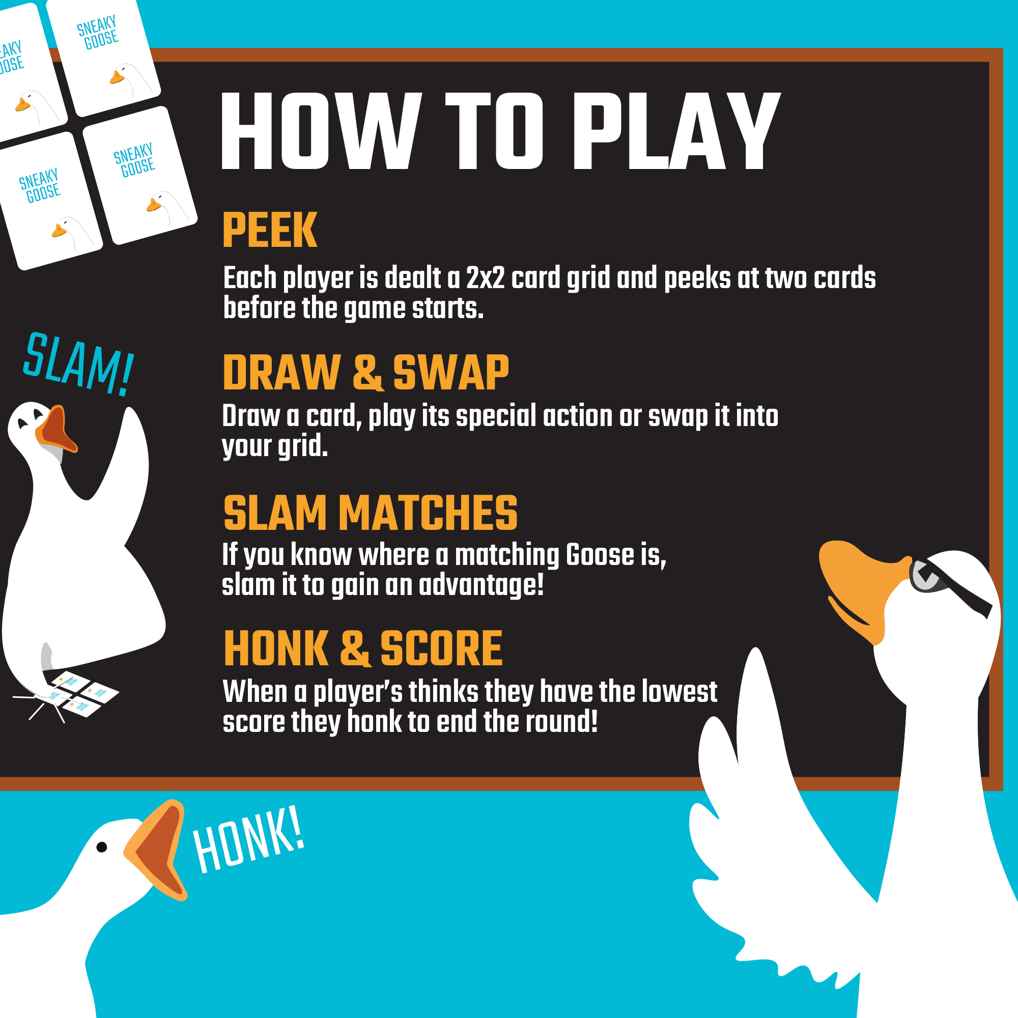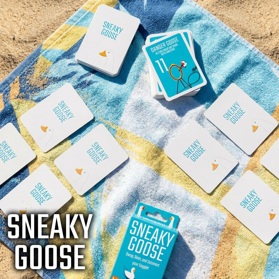 Sneaky Goose is a quick-thinking memory card game where players race to finish with the lowest score. Swap, steal and shed cards while trying to remember what’s in front of you, and what your opponents are hiding. Easy to learn but hard to master, Sneaky Goose blends memory, timing, and clever tactics. Players must decide when to swap cards, swap grids, and when to "HONK" to end the round before anyone else can improve their hand. Perfect for kids, friends, families, travel, and holidays, the compact game is designed for fast, flexible pick up and play. Enjoy a quick round when you’re short on time, or keep the fun going with multiple rounds, all in one compact package. No pen or paper? No problem. Sneaky Goose includes a free online score tracker to keep the game moving wherever you play. Portable, addictive, and full of surprising tac-tics, Sneaky Goose is the card game that keeps everyone on their toes.