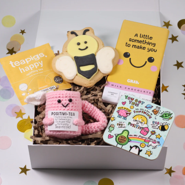 Send a comforting hug through the post with our uplifting Mini Tea Gift Box – Little Positivi-tea Cheer Up Care Package– a thoughtful gift designed to brighten someone’s day and remind them they’ve got this. Perfect as a thinking of you gift, encouragement gift, get well soon present, exam good luck gift, or just-because surprise, this cheerful box combines positivity, sweet treats and comforting moments in one beautifully curated package. Every item has been chosen to bring a smile – from the adorable crochet companion and delicious chocolate to the inspiring coaster filled with cheerful “positivi-tea” messages. All of the products in our beautiful boxes have been lovingly selected and are hand packed in a keepsake magnetic white gift box. Each box includes a card, which you can add a personalised message to, making your hug even more special.