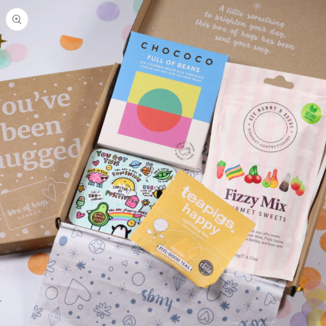 Send a little sunshine straight through their letterbox with our cheerful Letterbox Sweet Treat Gift Box – Positivity Cheer Up Package. Packed with sweet treats, uplifting tea and a colourful positivity coaster, this thoughtful gift is designed to brighten someone’s day and remind them they’ve got this. Carefully hand-packed in our ‘You’ve Been Hugged’ letterbox box, this thoughtful gift fits straight through the door and is delivered via Royal Mail 24 Tracked, making it a lovely surprise they’ll never forget. From indulgent chocolate to tasty sweets and a comforting cuppa, it’s a small box bursting with love, comfort and smiles. Inside the lid, they’ll find the reassuring message: ✨ “A little something to brighten your day, this Box of Hugs has been sent your way.” ✨