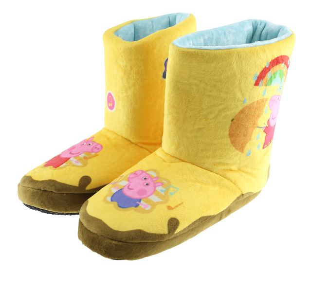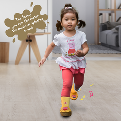 • SOFT PLUSH WELLIES - Universal fit for ages 2-5! • BUILT-IN SOUND TO ONE OF THE WELLY’S! - 2 modes • MODE 1*: SPLISH! SPLASH! - Creates the sounds of jumping in muddy puddles as the child jumps up and down! The faster the child jumps or bounds, the faster the sound! • MODE 2*: Peppa Pig theme tune - The tune gets faster as the child walks faster! • AUTO OFF – Conserves battery power when not in use