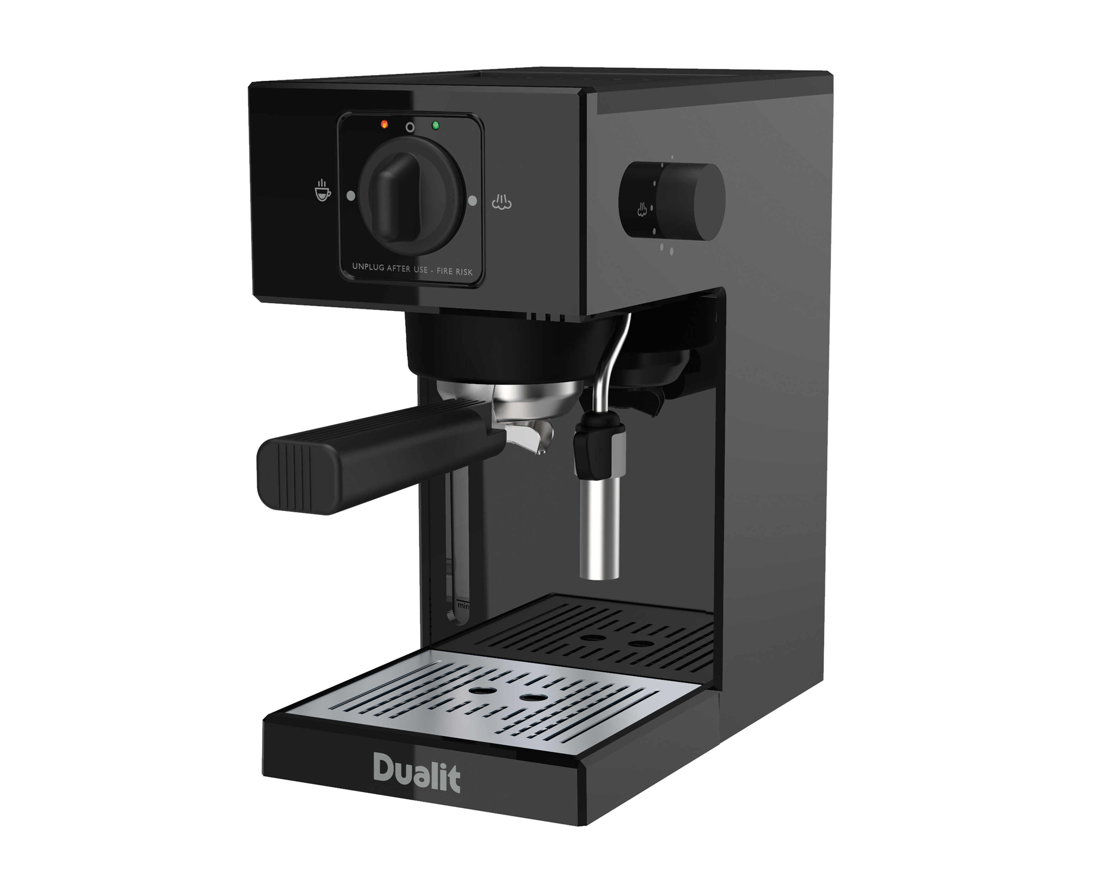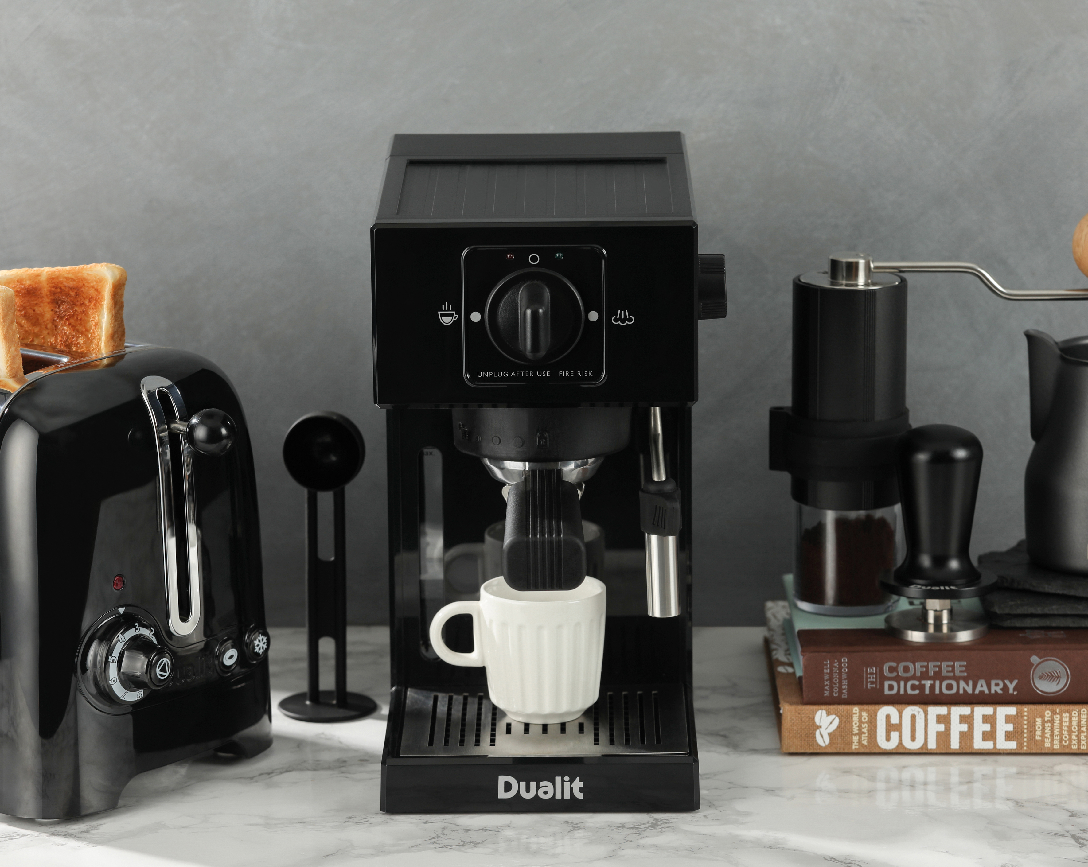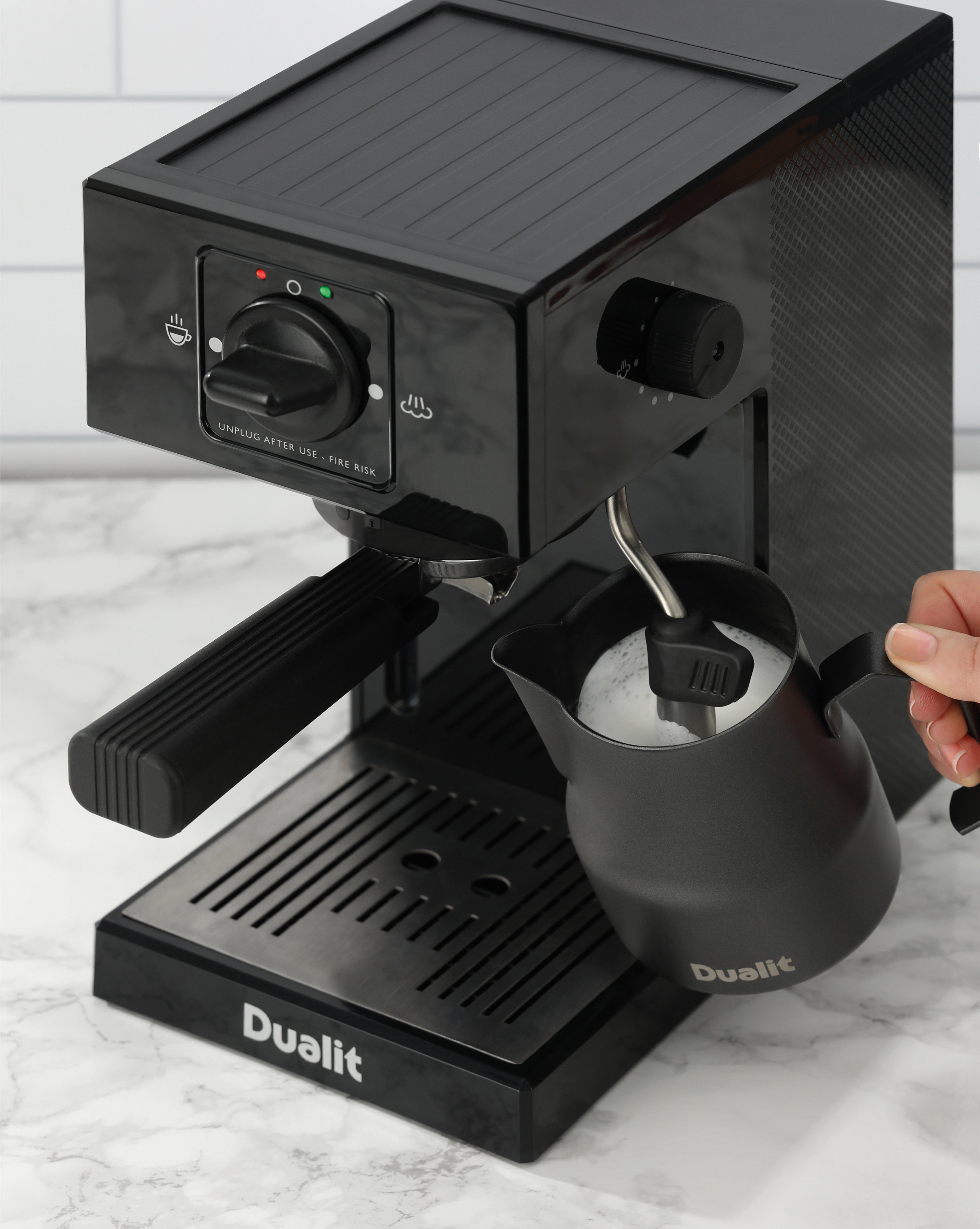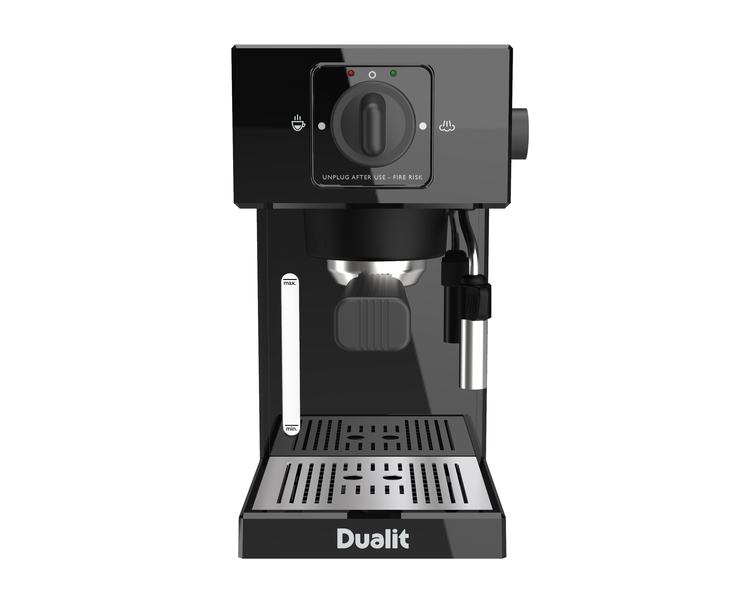 Dualit's Espresso Coffee Machine boasts coffee-shop standard quality without the fuss. It is fast, easy to use and makes consistently good coffee all in a sleek and compact design that won’t take up too much space on the worktop. Compatible with both freshly ground coffee or mess-free ESE pods, it has a powerful, built-in boiler that heats water and creates steam. The machine is operated by an easy to use dial and is ready to use in just 90 seconds. A built-in Milk Frother is on board to create a range of indulgent drinks with lashings of froth, such as cappuccinos, lattes, hot chocolates or even babycinos! However, not everyone likes a frothy coffee so Dualit’s Espresso Coffee Machine can simply steam milk instead, enough to liven up a classic Americano.
