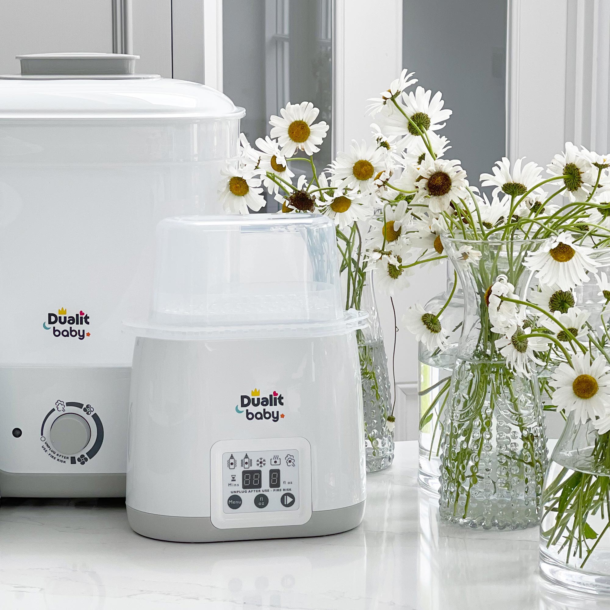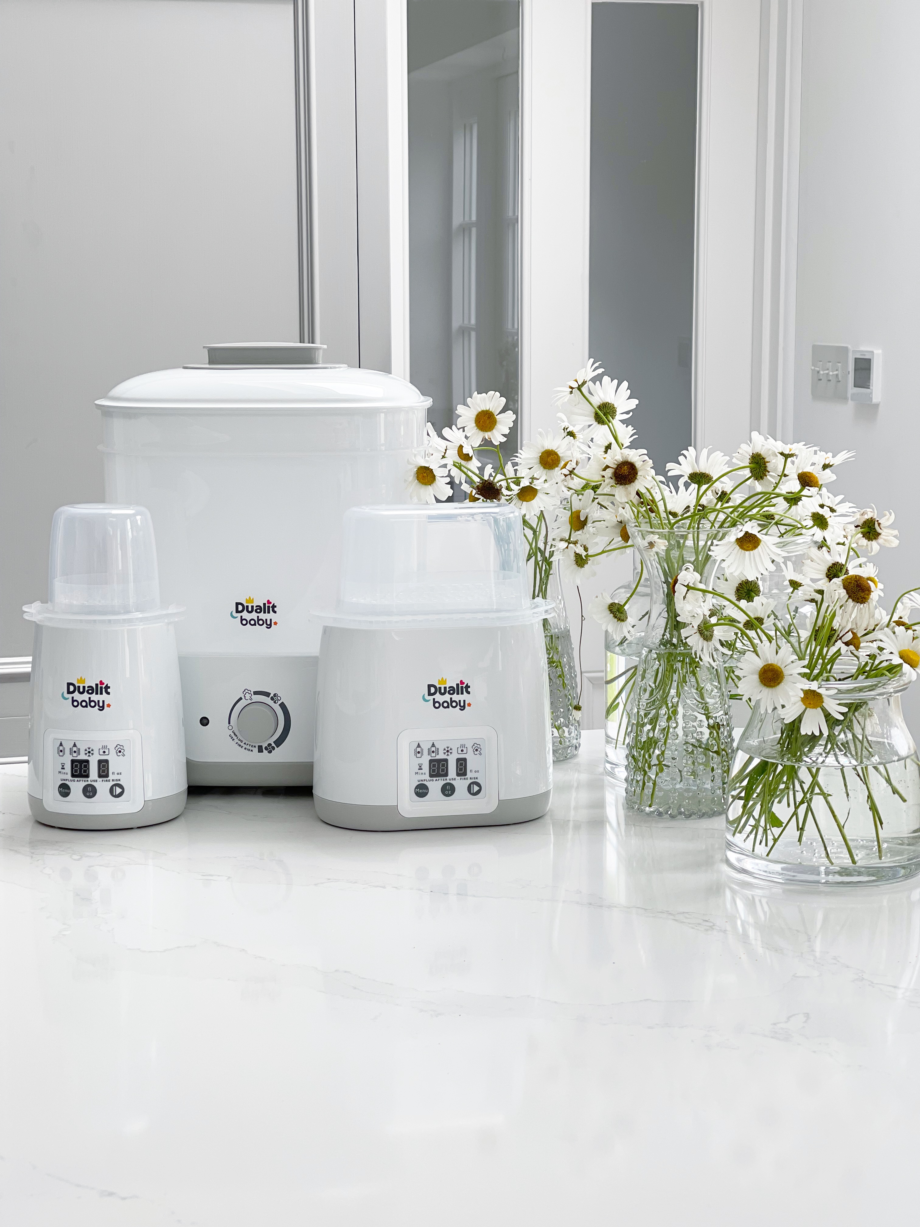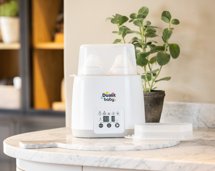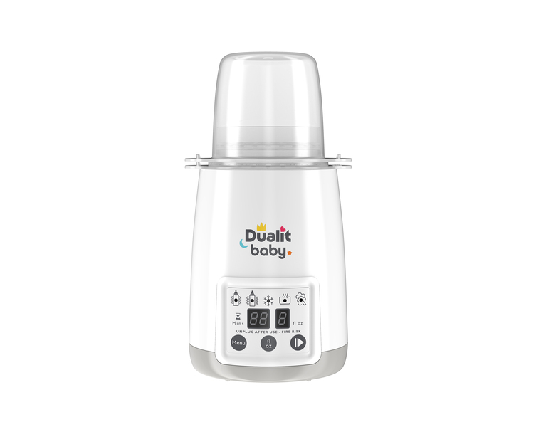 Dualit Baby’s easy to use, multi-functioning Bottle Warmers are designed to sterilise, defrost and warm baby formula, baby food and breast milk. Users can ensure that food or milk is at the optimum temperature for little ones by using the electronic control panel and simply selecting the volume in fluid ounces of the contents. The Bottle Warmer will then calculate how long to defrost or heat to a safe temperature, gently warming to preserve essential nutrients and removing any worry of hot spots. If short on time, a ‘Fast Warm’ function can warm milk 20% faster than the normal cycle, ideal for hungry babies! The handy sterilising function also kills 99.9% of harmful bacteria. Featuring a contemporary design, the Bottle Warmers are available in Single and Double formations priced from £35-£39 to cater for individual or multiple babies, and are compatible with plastic, silicon and glass as well as single-walled bottles.* * Dualit Baby Bottle Warmers can fit bottles up to a diameter of 80mm and sterilise bottles up to 105mm tall (without collars, teats and lids); large enough for most sizes, shapes and brands of bottles to fit comfortably