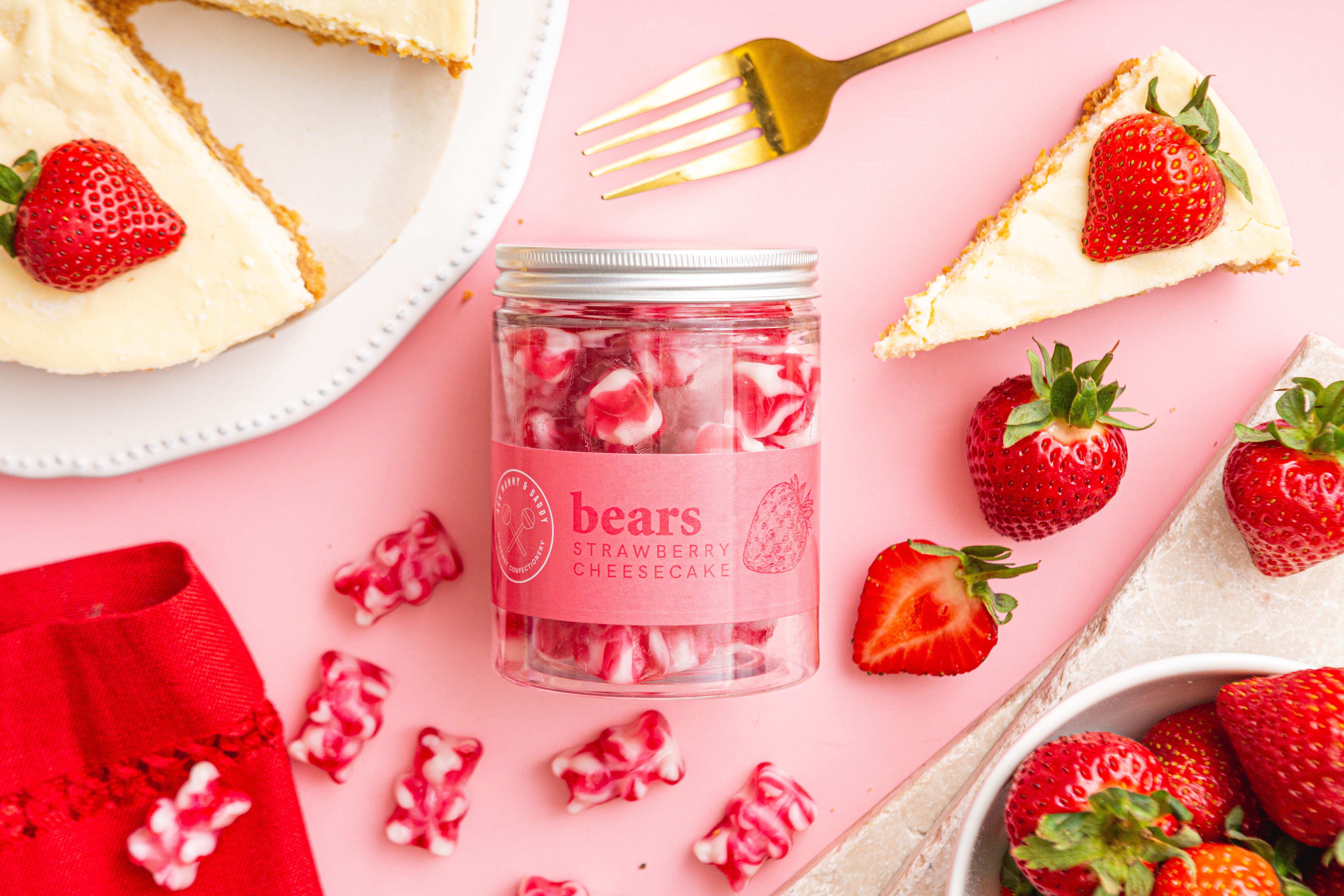 These bears are like a big chunky slice of cheesecake topped with fresh English strawberries. The gummy bear version of this summer classic.
