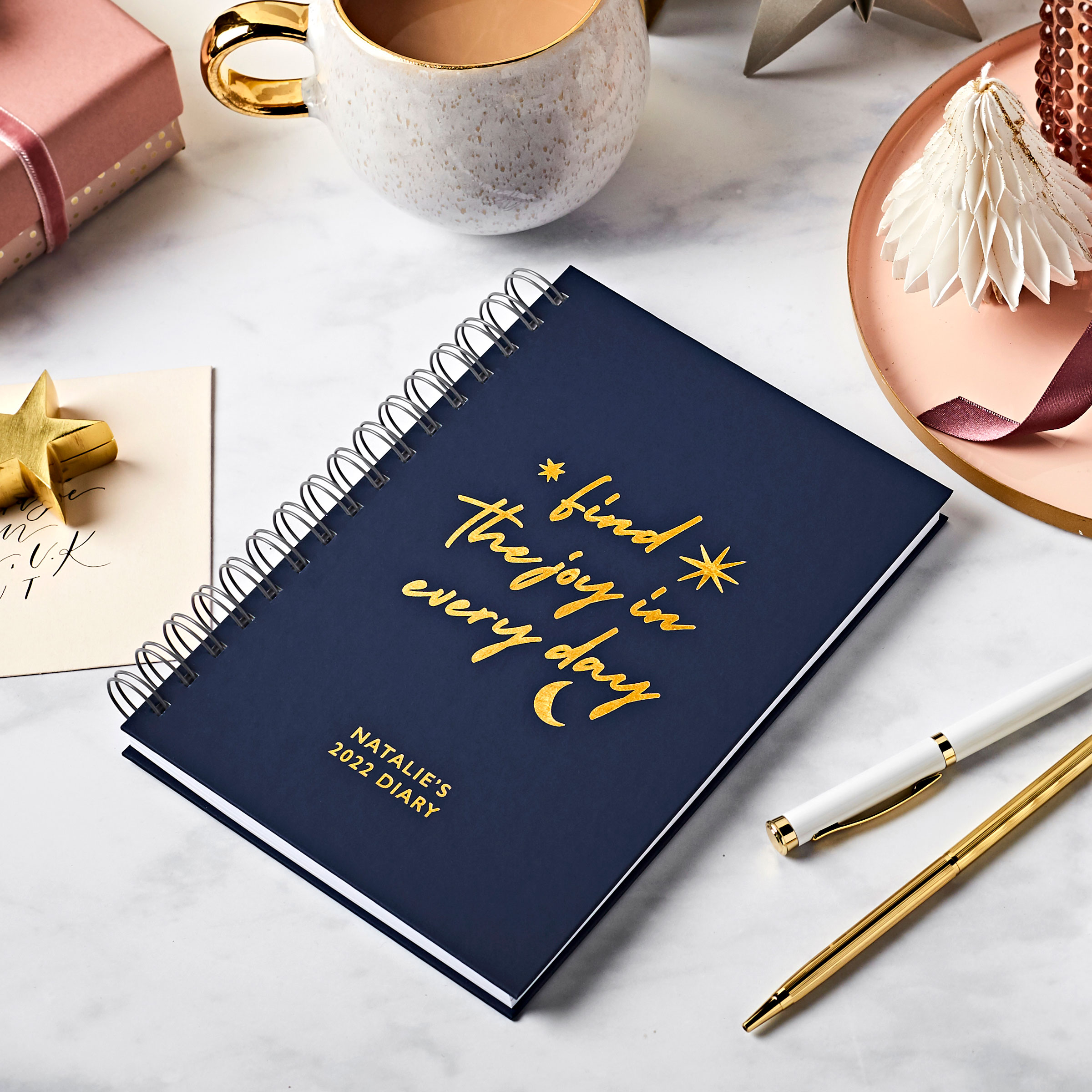 Find the joy in every day with this inspiring hardback Personalised Joyful 2022 Weekly Diary, featuring a modern brush-lettered and celestial design. With our most popular week-to-view layout inside, this diary is sure to delight throughout 2022. Make your planning a pleasure with this delightful personalised Joyful 2022 Weekly Diary. The diary comes with the phrase ‘find the joy in every day’ in a brush script complete with a starry design, foiled above the personalised name. Both are printed with your choice of copper, gold or silver foil. Inside the Joyful 2022 Weekly Diary a yearly planner, monthly spreads, weekly diary pages and additional notes pages printed on thick white paper. An optional personalised inside message page can be added, which is made from a lovely thicker soft blue paper.