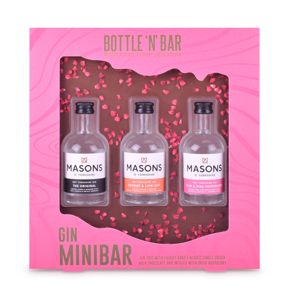 All the joy of the hotel minibar in a box. This delightful gift includes three miniature bottles of gin all surrounded by a delicious, and extremely large, bar of chocolate with crushed raspberries. Contents: THE ORIGINALGIN 5cl Alc. 42%vol. Juniper, citrus and warming spice. Rich, smooth and boldly aromatic. ORANGE AND LIME LEAF GIN 5cl Alc.42%vol. Juniper, orange and lime leaf. Punchy and fragrant with a long, dry finish. PEAR AND PINK PEPPERCORN GIN 5cl Alc. 42%vol. Juniper, pear, pink peppercorns and rose. Balanced, aromatic and elegantly sweet. SINGLE ORIGIN MILK CHOCOLATE BAR HAND FINISHED WITH CRUSHED RASPBERRIES. 250g