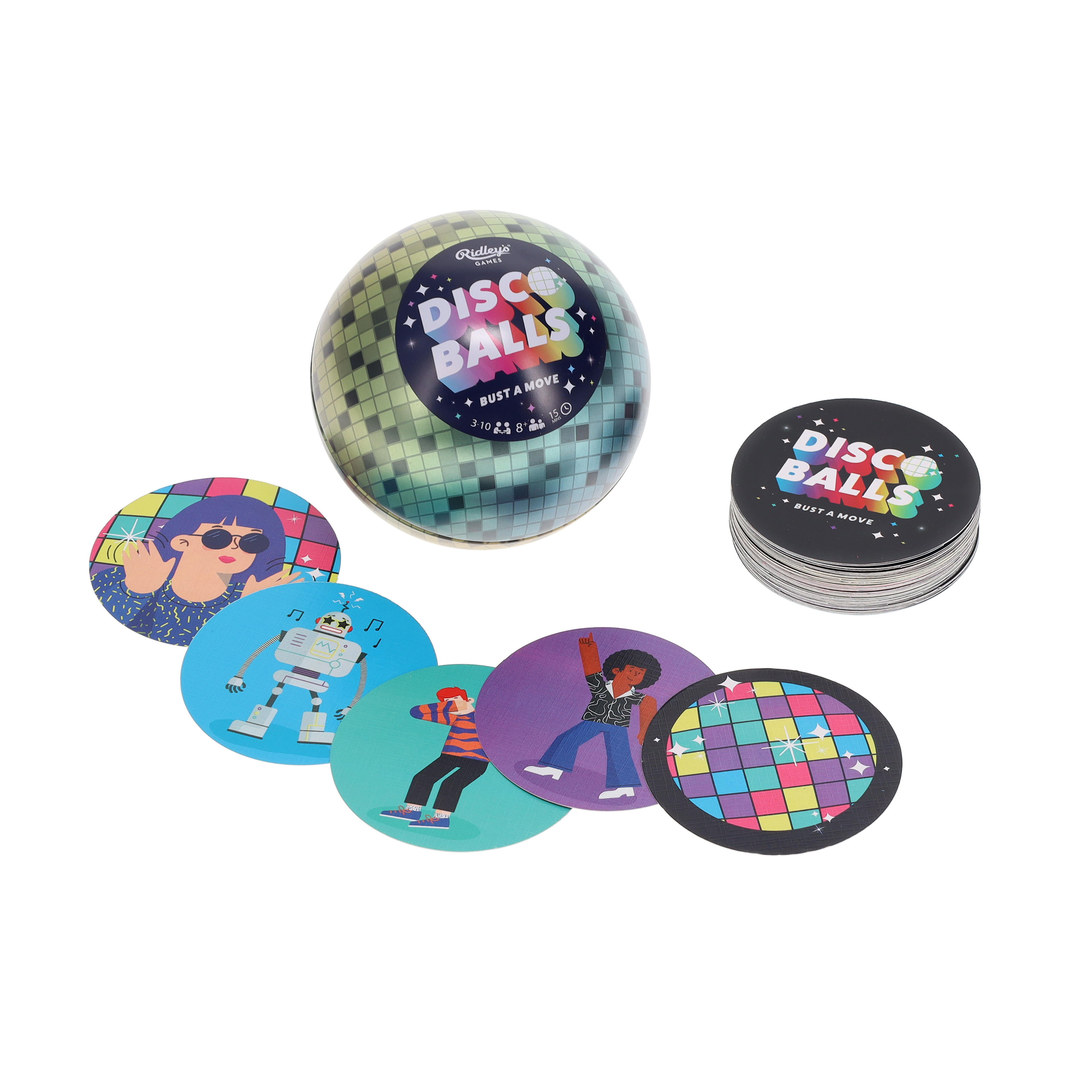 Put on your dancing shoes! It's time to put your moves to the test with this funky card game of hilarious missteps from Ridley's Games! When the 'DJ' shouts Disc-go!, each player simultaneously plays the top card from their hand, and when a matching pair is revealed, make sure you're the first to bust the right move! The player with the most cards at the end of the game is the winner (and dancing queen!). Whether you're channeling your Travolta vibes, sinking to the floor doing the Swim, or getting on down with one of the other moves, this is a dance party that will keep you on your toes and that's fun for the whole family! All of the dance cards are dynamically illustrated with vibrant neon colors and come packaged in a groovy disco ball tin! Perfect for families and groups of friends, Disco Balls is suitable for ages 8+, 3 to 6 players, and has an average of 15 minutes gameplay.