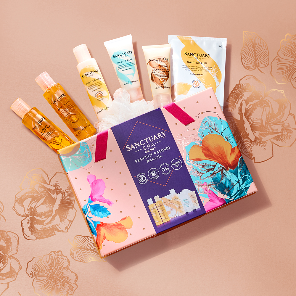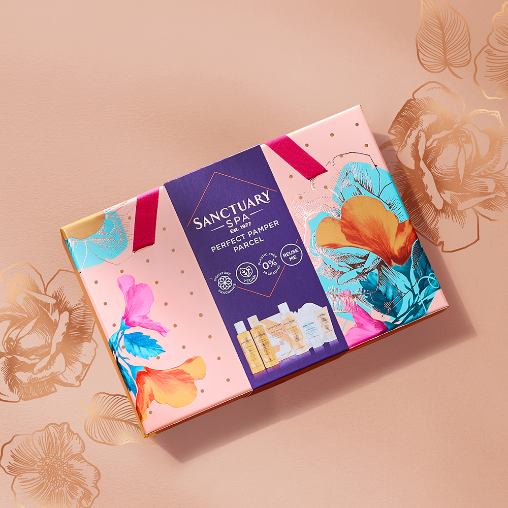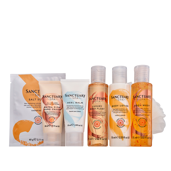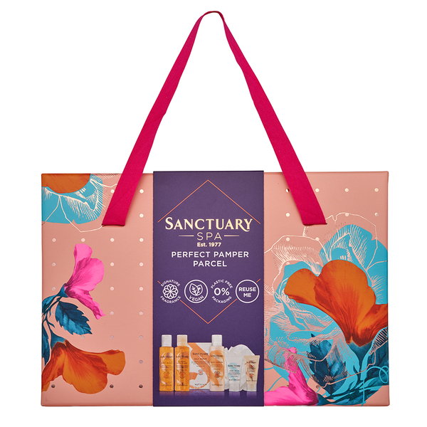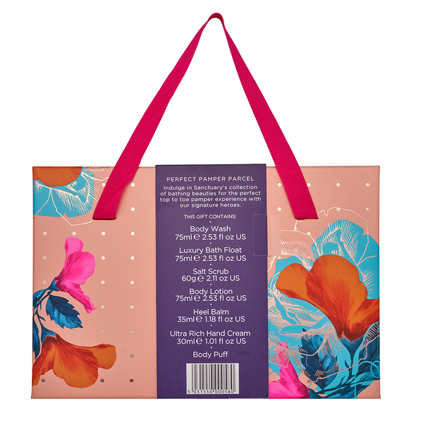 Signature Sanctuary Perfect Pamper Parcel is the perfect way to treat someone special to a little much needed TLC! They can indulge in Sanctuary's collection of bathing beauties for the perfect top to toe pamper experience with their signature heroes. Vegan Friendly. Outer packaging 100% recyclable made with FSC-certified paperboard. Contains: Body Wash 75ml Luxury Bath Float 75ml Salt Scrub 60g Body Lotion 75ml Heel Balm 35ml Ultra Rich Hand Cream 30ml Body Puff