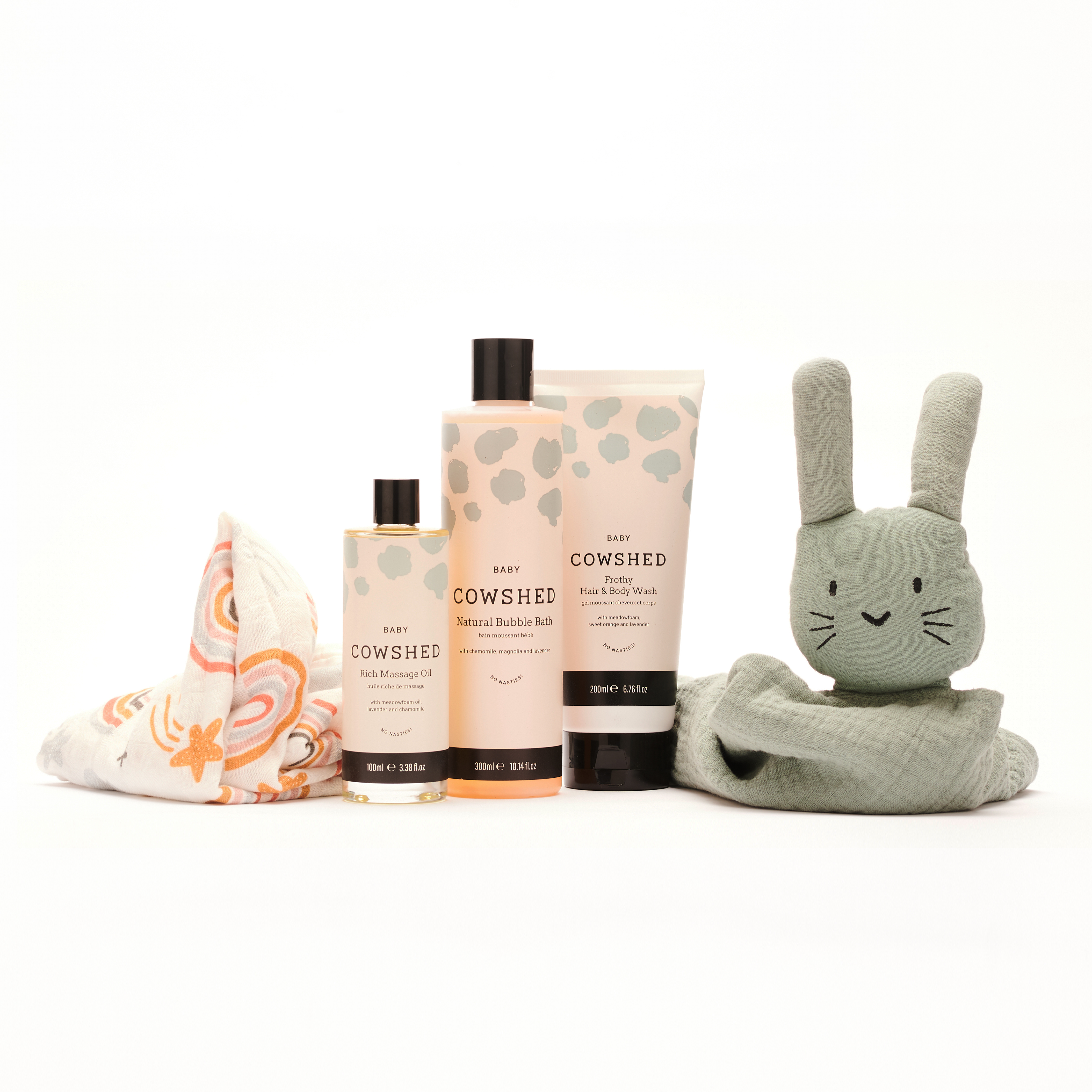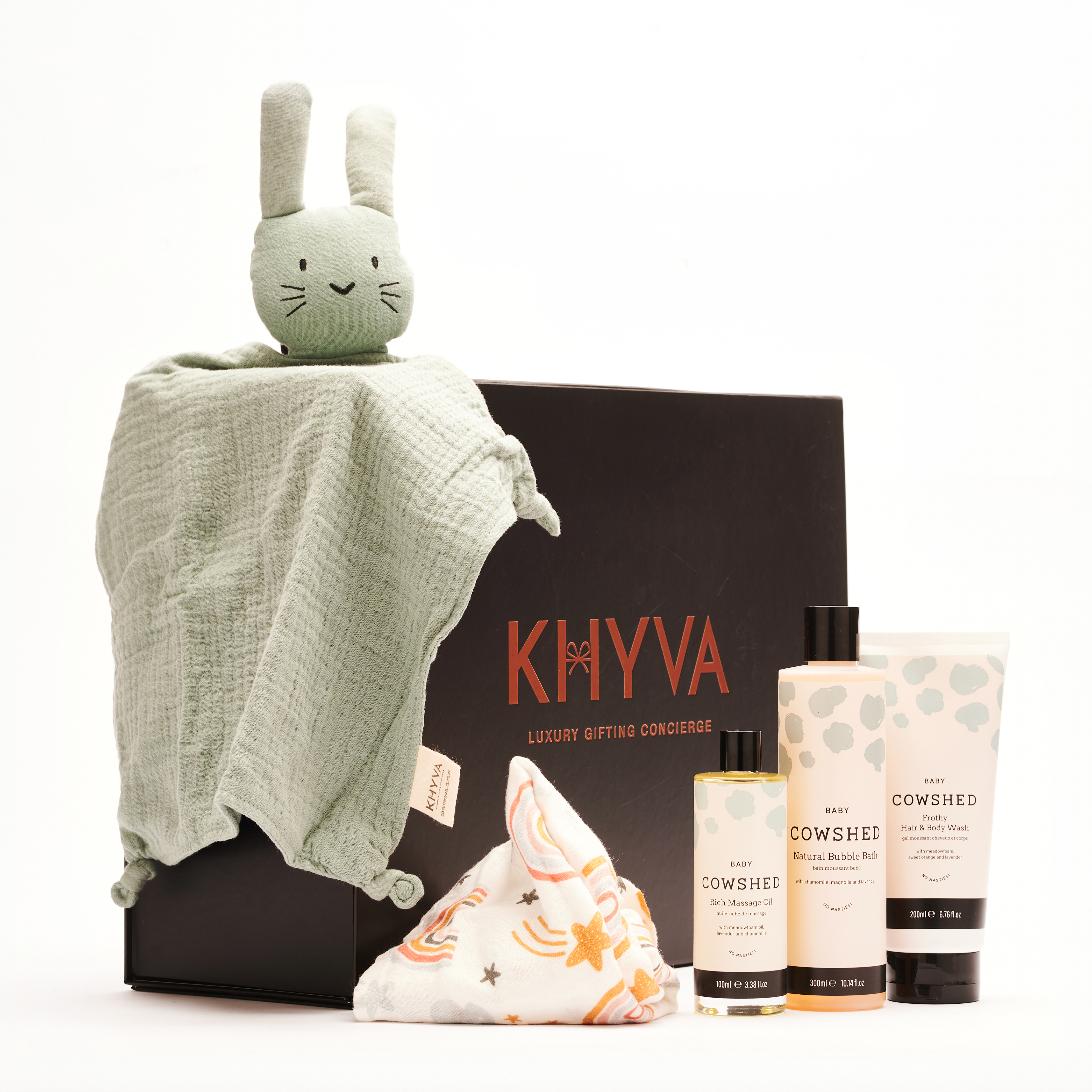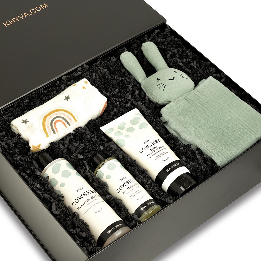 Know someone who's expecting, or a parent of a newborn? Give them everything they need for their little bundle of joy with the Baby Spa Luxury Beauty Gift Set. Exclusive to Moonpig, this extra-special hamper contains an array of baby bathtime essentials. Perfectly presented in a stylish gift box, it's a thoughtful present which both parents and little one will love. Contains: Cowshed Baby Bubble Bath 300ml Cowshed Baby Frothy Hair & Body Wash 200ml Organic Cotton Muslin Baby Animal Comforter Cowshed Baby Rich Massage Oil 100ml Bamboo Cotton Rainbow Baby Muslin