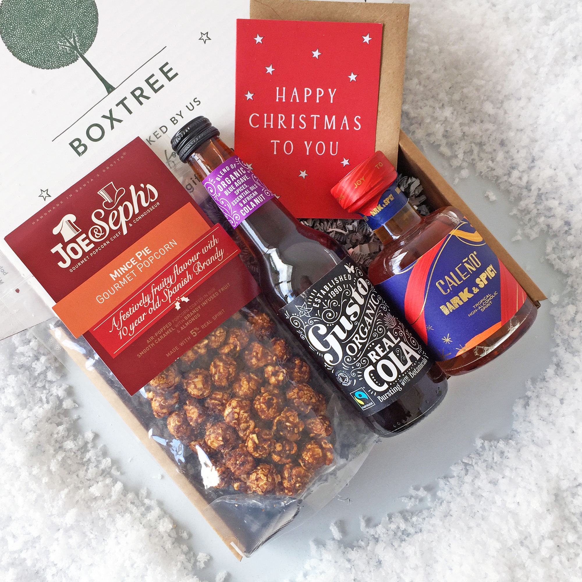 Enjoy the spirit of Christmas with this delicious trio. Team the dark and spicy flavours from Caleno's non-alcoholic spirit with Gusto's Real Cola for a full on festive treat, and nibble on some tasty mince pie popcorn sprinkled with the Christmas spirit! WHAT'S IN THE BOX? Dark & Spicy Tropical Non-Alcoholic Spirit 50ml // Caleno Delicious non-alcoholic spirit teamed with a mixer and ice Real Cola Bottle 275ml // Gusto Award winning organic cola Mince Pie Gourmet Popcorn // Joe & Seph Tasty brandy and festive spiced popcorn Gift Wrap, Gift Box & Hand-written Card