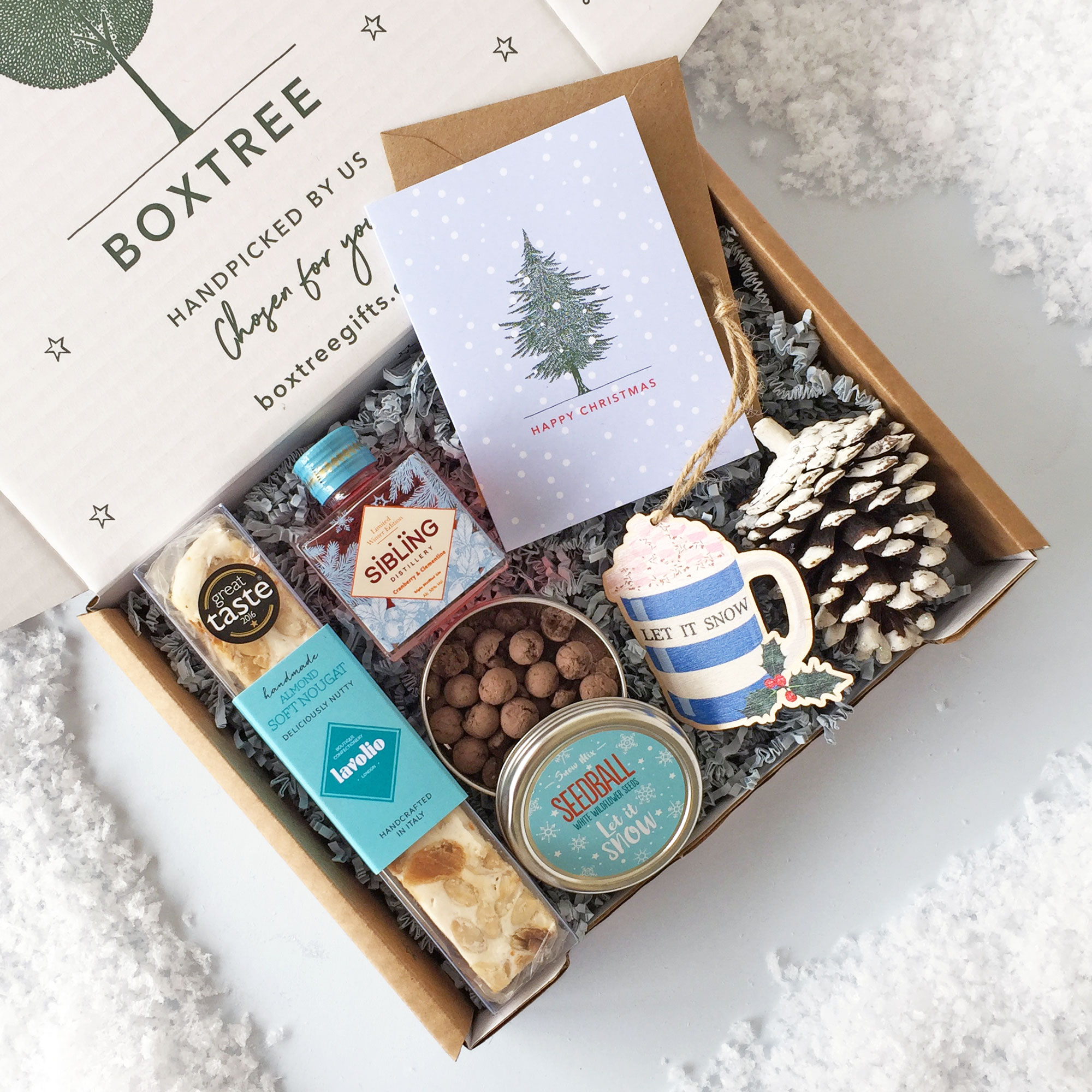 We love this festive snowy filled hamper packed with luxury gifts. Delicious soft artisan nougat, a cranberry and clementine gin, our limited-edition 'Let It Snow' wooden Christmas decoration and a white flower seedmix for the new year, it's like a box full of snowflakes! Looking for an extra special treat? Then why not super size your gin! Winter Edition Gin 50ml or 350ml // Sibling The perfect blend of cranberry and clementine Grow Your Own Wildflowers // Seedball Ready-to-plant in a pot or on the windowsill Let It Snow Wooden Decoration // Corniche Cards Cornishware inspired wooden hanging decoration Almond Soft Artisan Nougat // Lavolio Award winning luxury handcrafted torrone Festive Gift Wrap, Gift Box & Hand-written Card THIS GIFT GIVES BACK Seedball are on a mission to help increase the abundance of British wildflowers and wildlife that depend upon them. Peat-free, bee-friendly and made in the UK.